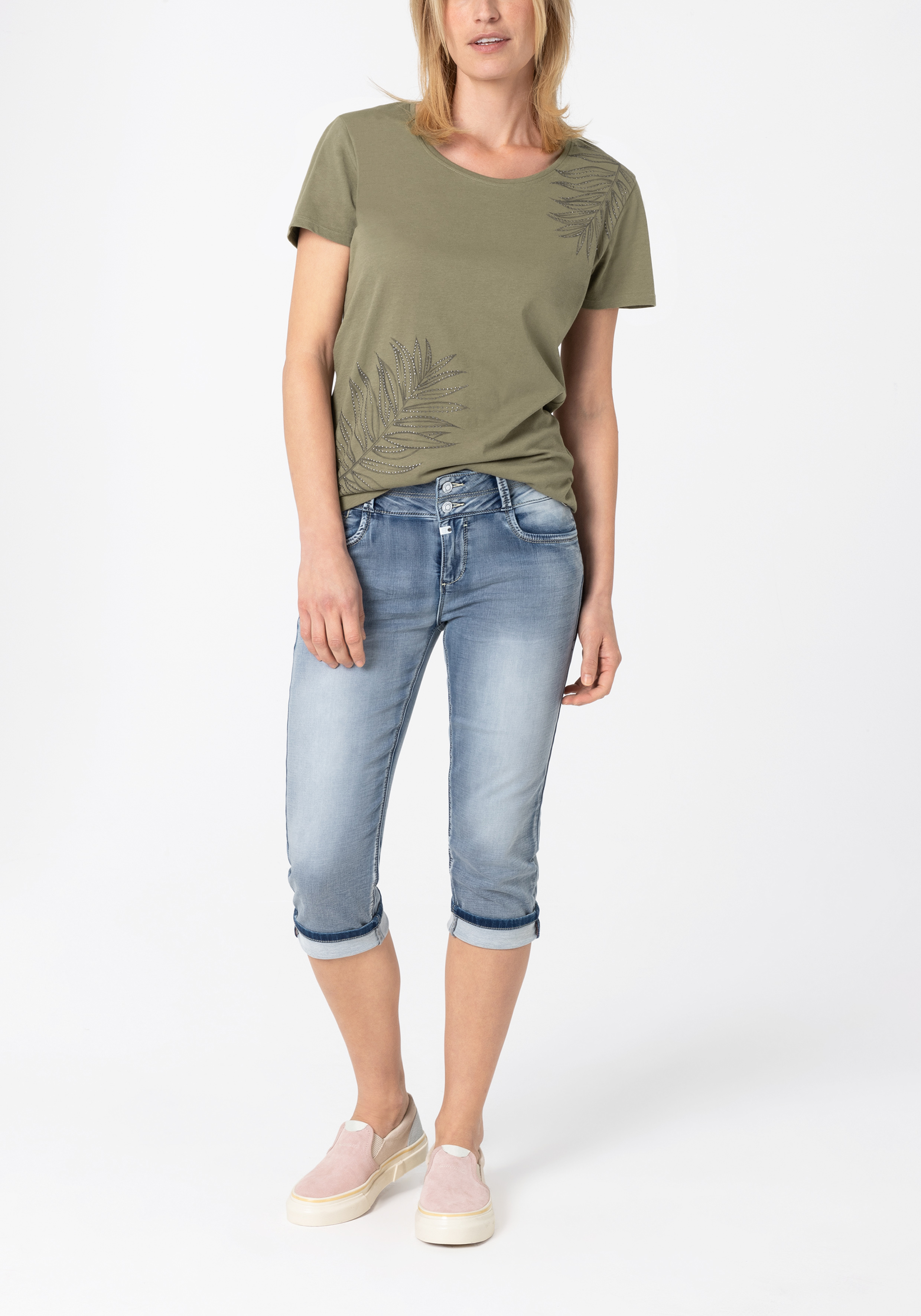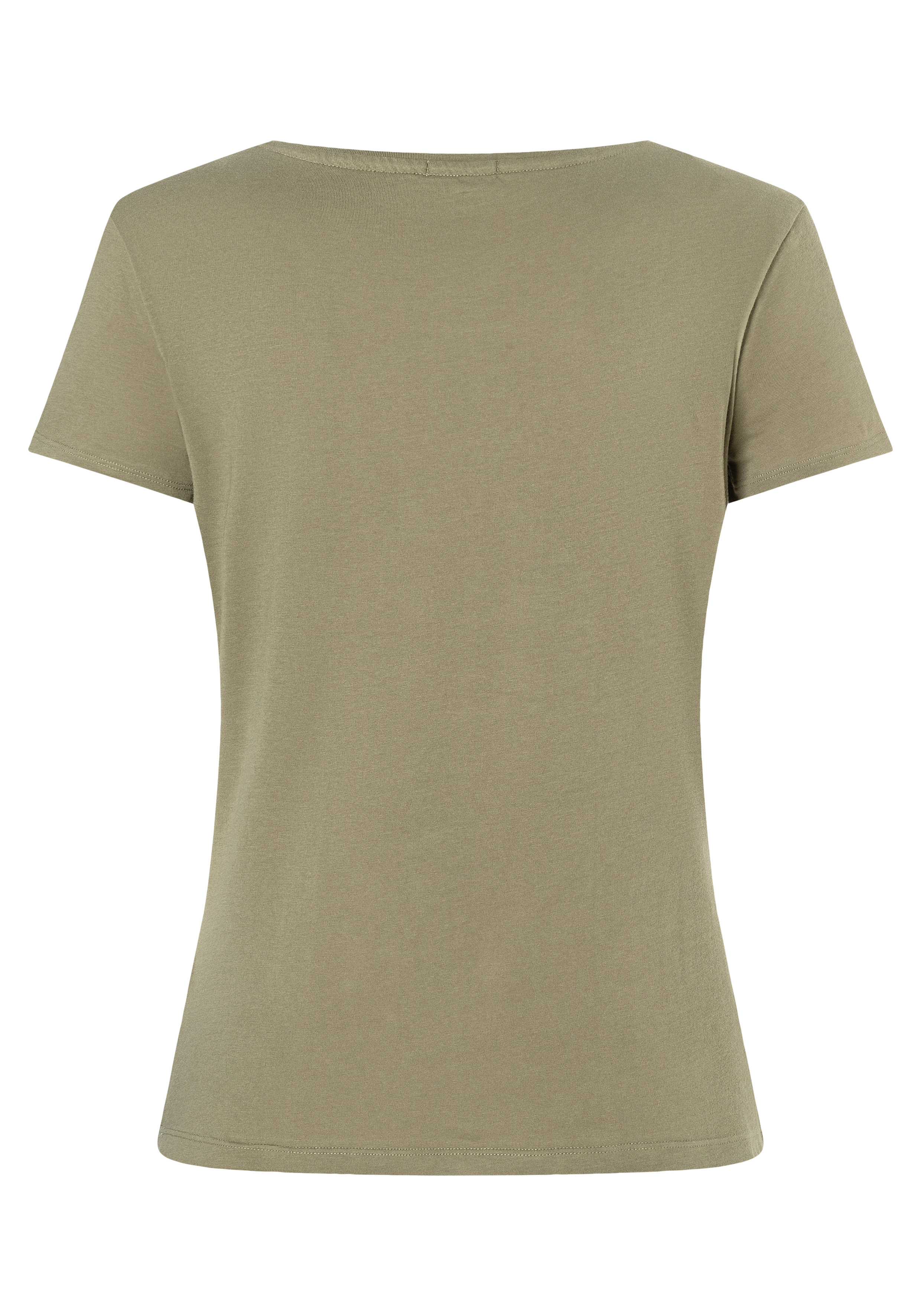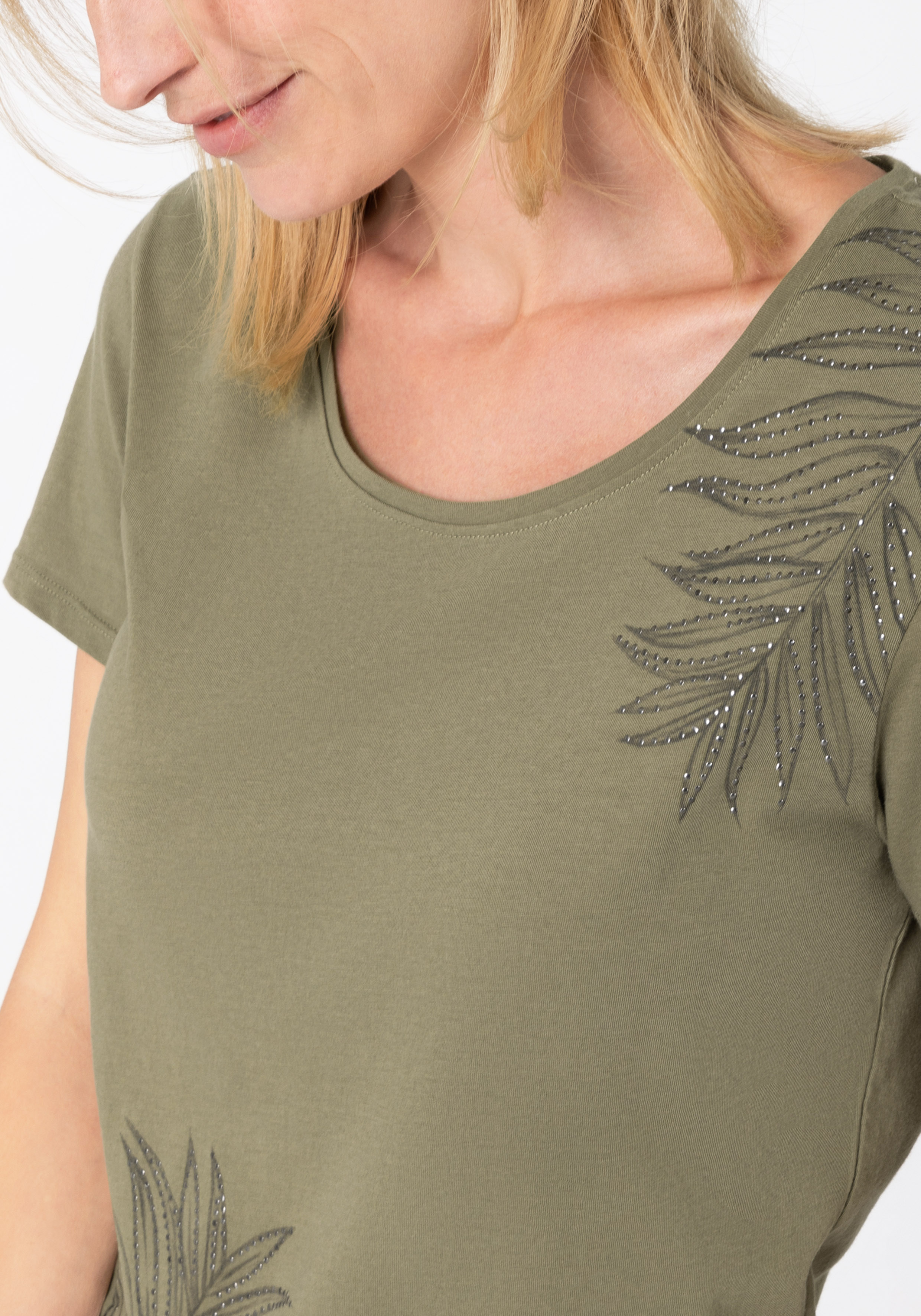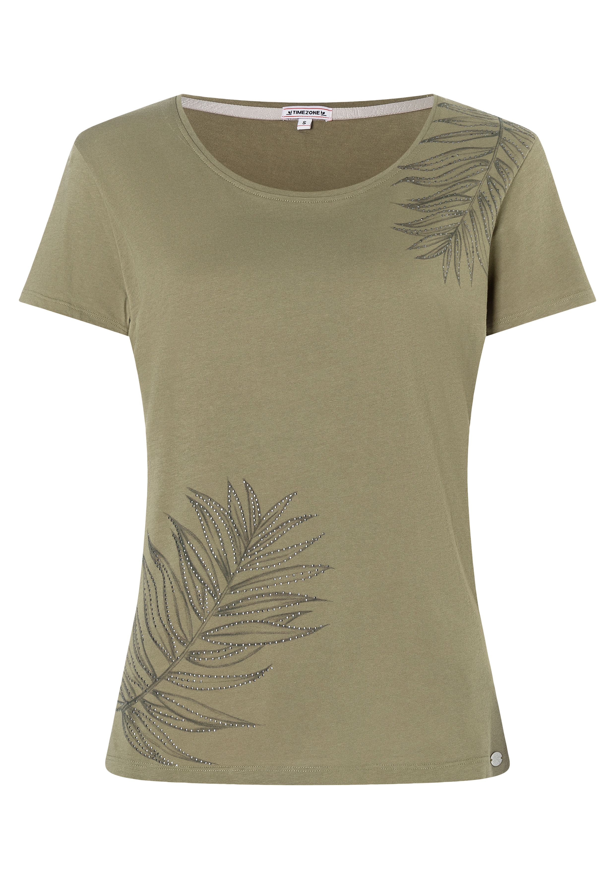 Basic T-Shirt ,klassischer Regular Fit,weiter, femininer Rundhalsausschnitt , klassisches Kurzarm-Design, Vorderteil mit Print-Motiv an Schulter und Saum , mit kleinen silberfarbenen Nieten dekoriert, feminine Logo-Plakette am Saum , klassische Two-Needle-Stitching an allen Kanten