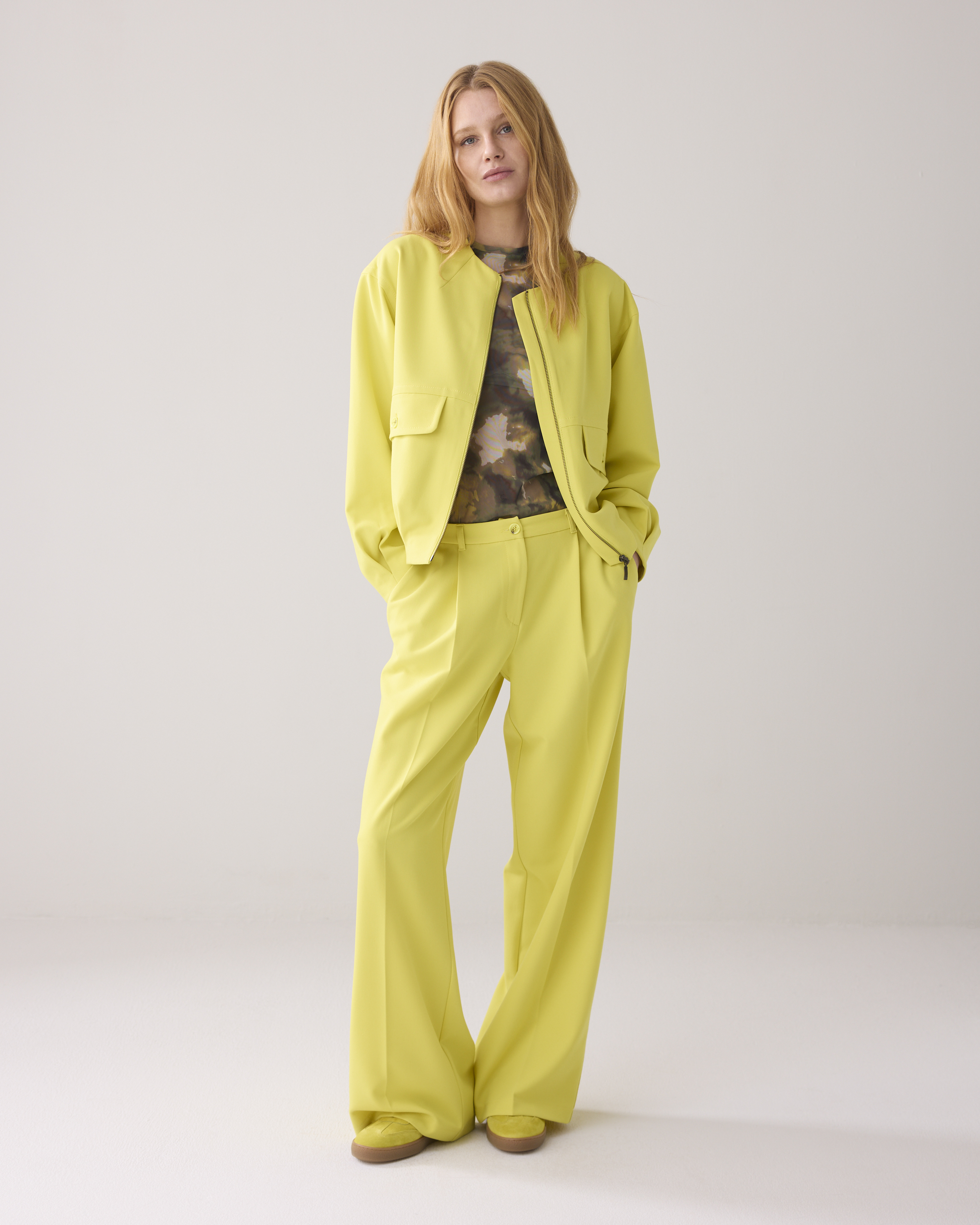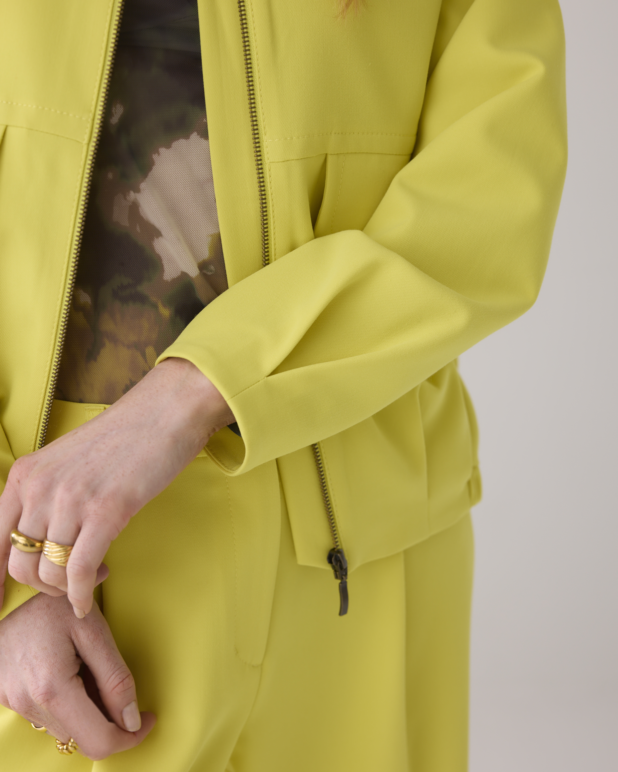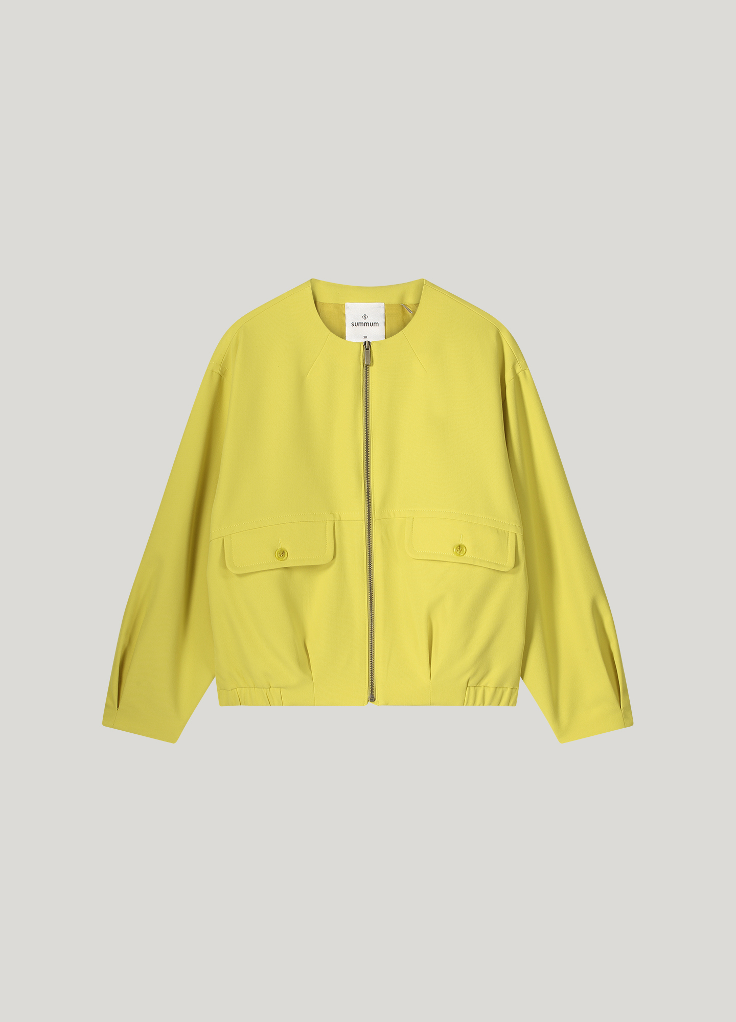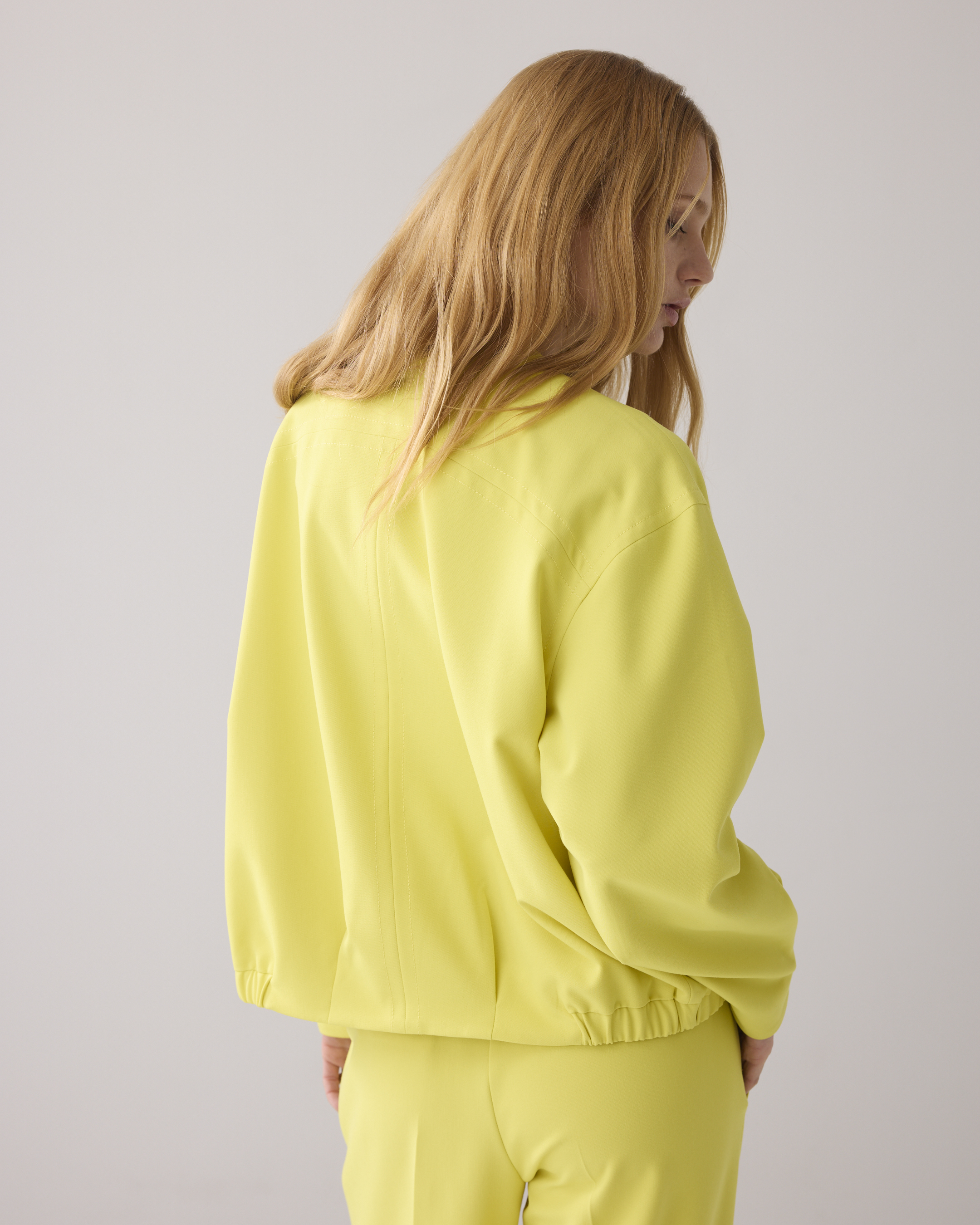 Voluminöse Bomberjacke mit lockerer Passform, der seitliche Gummizug am Saum sorgt für Volumen. Die Jacke hat vorne Pattentaschen und lange Ärmel mit Kellerfalten.