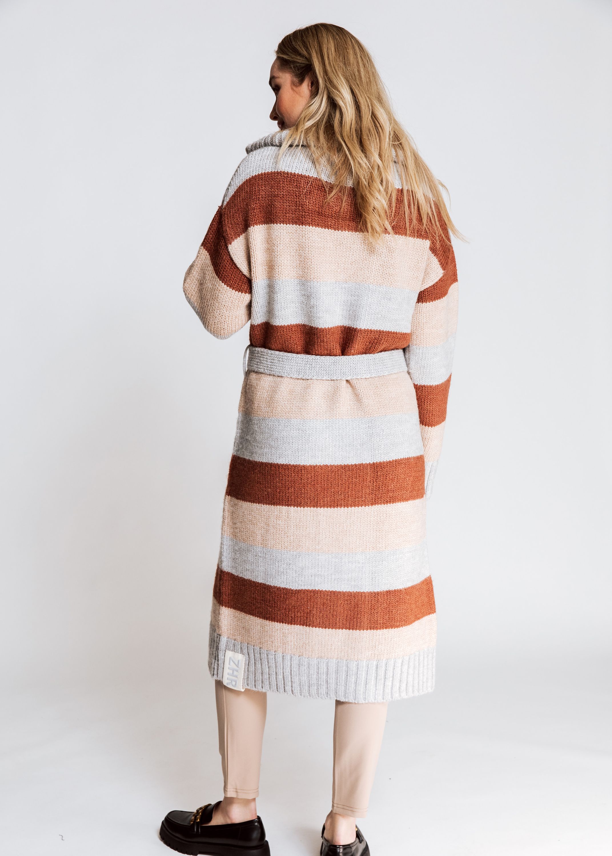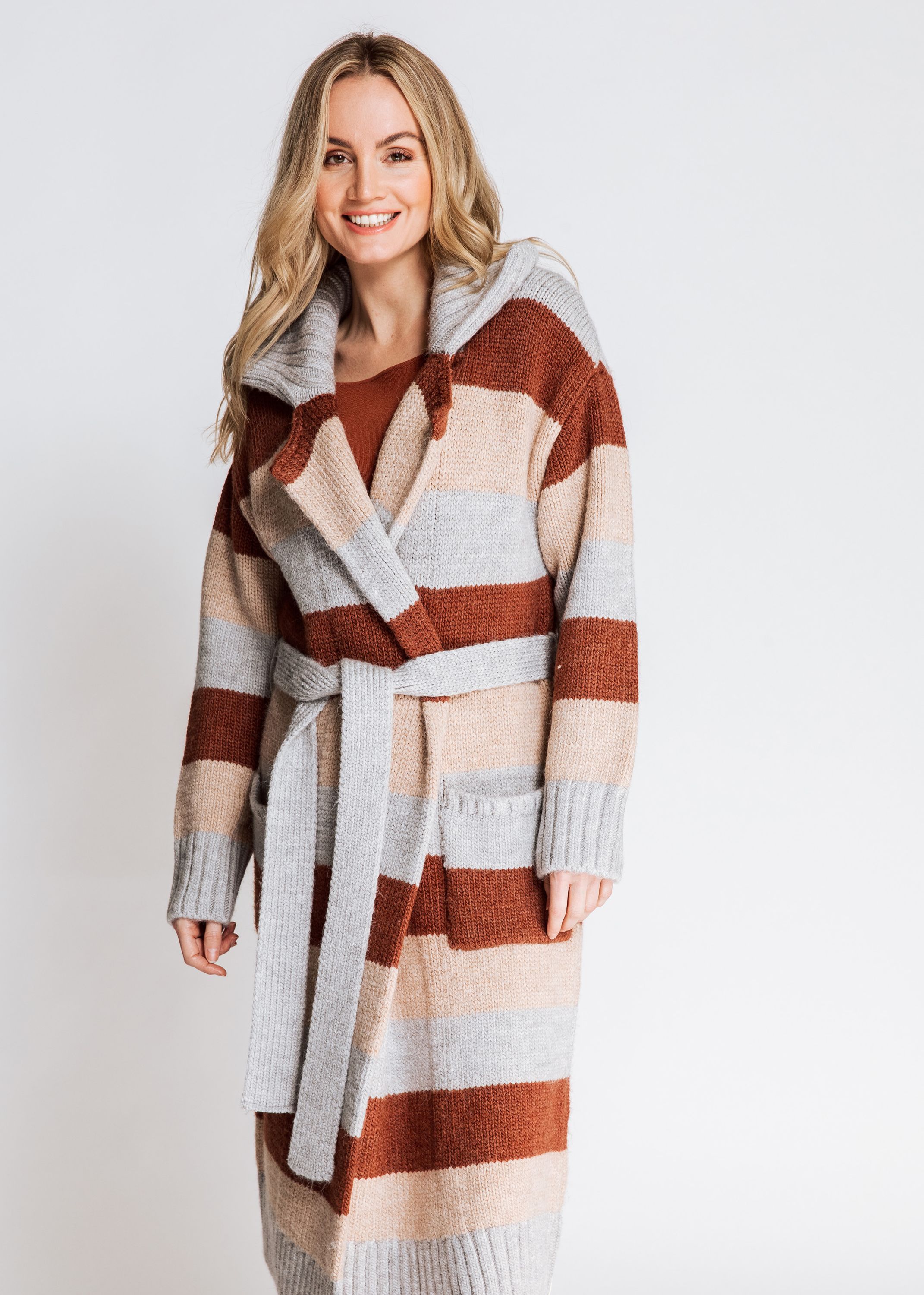 Wadenlange Strickjacke mit Blockstreifen in regular fit , große Eingrifftaschen, Jacke mit Gürtel,