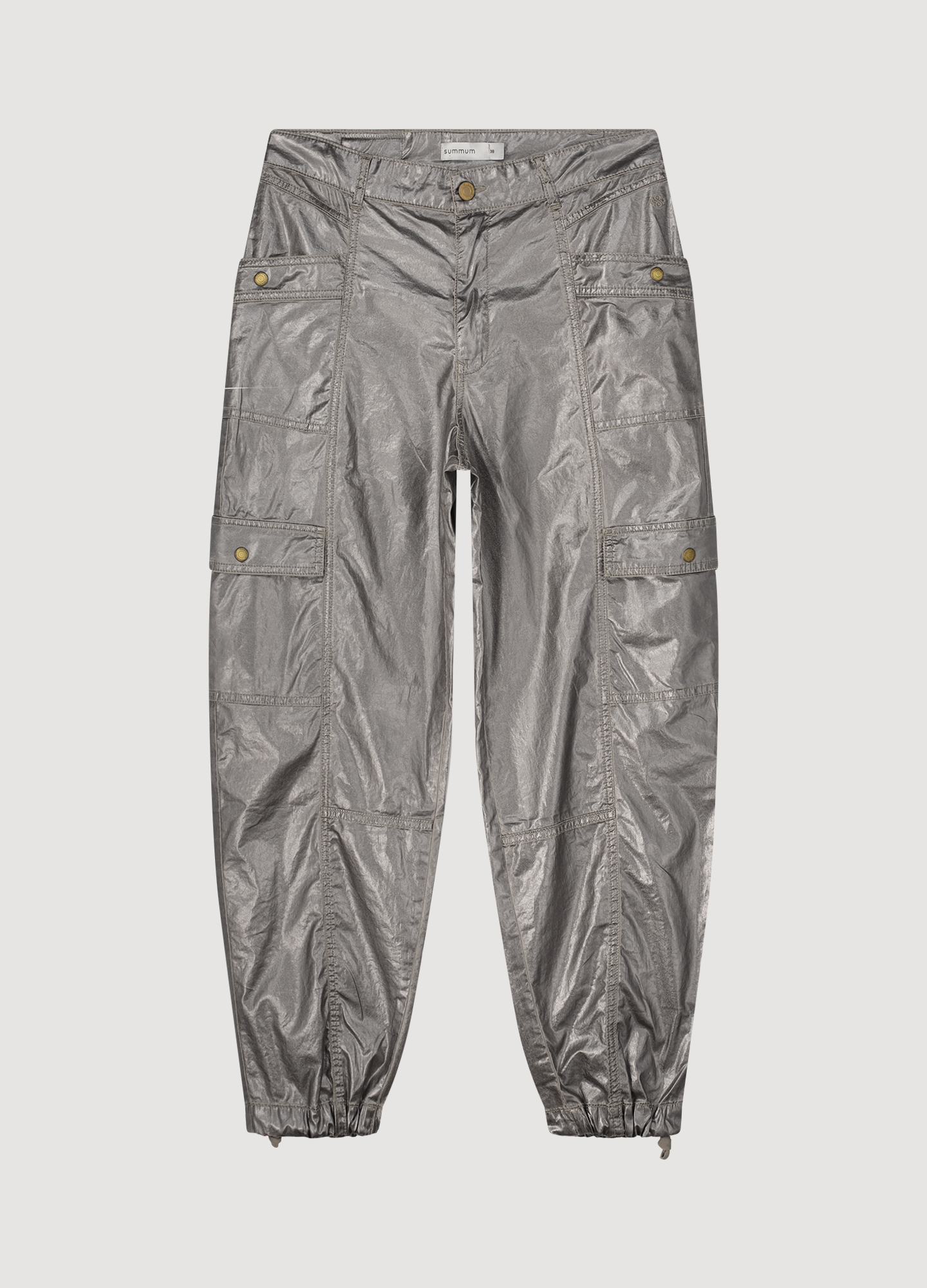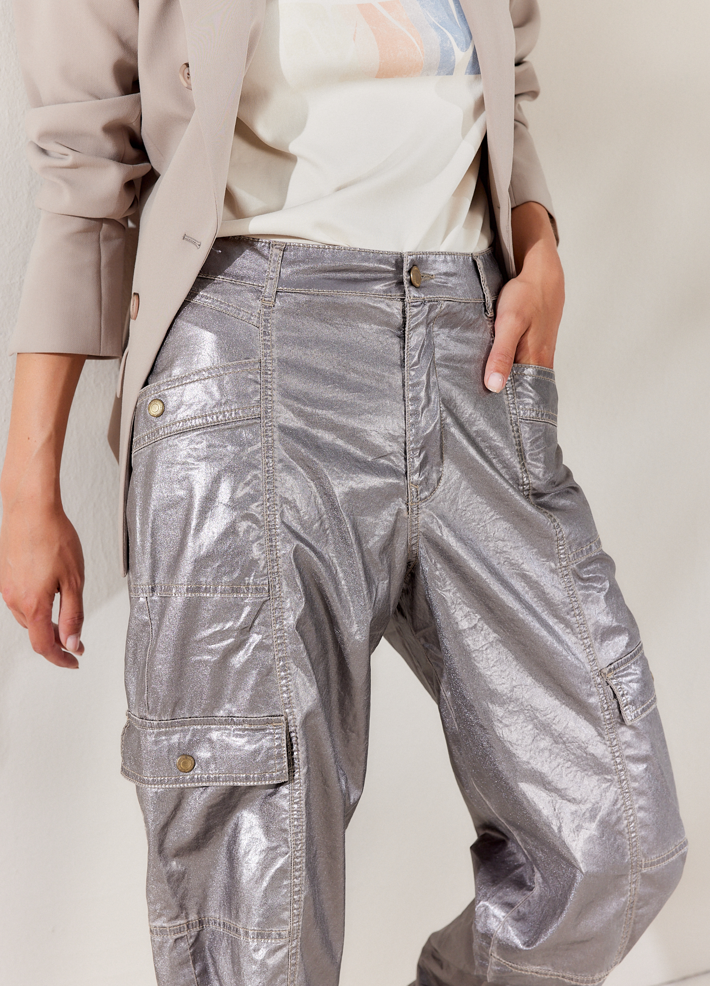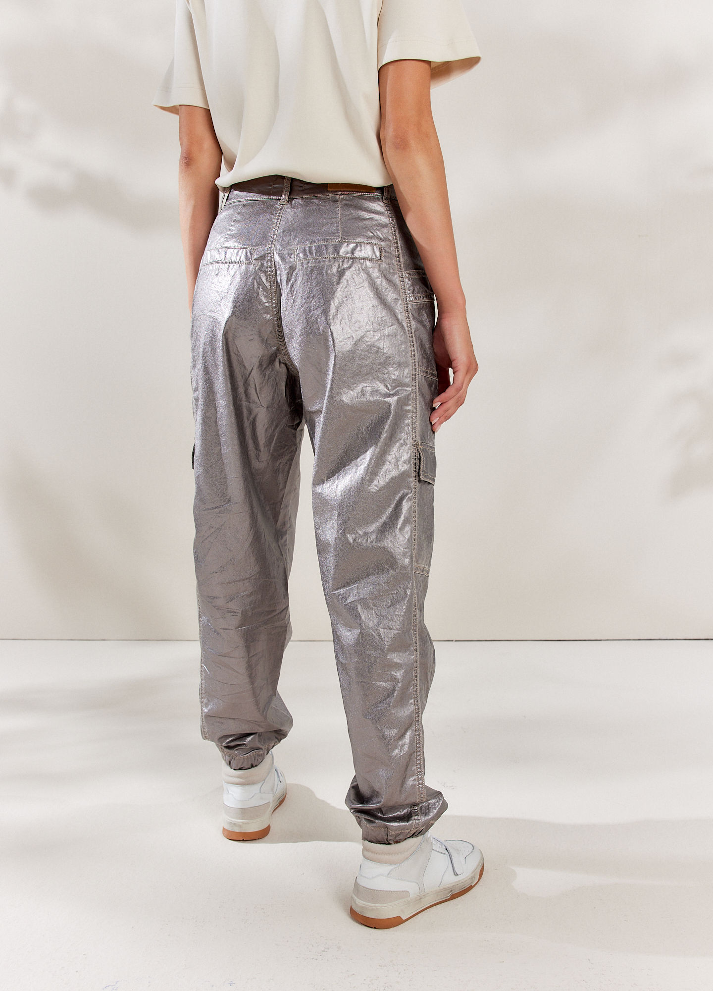 Locker sitzende Cargohose mit glänzender Folienbeschichtung. Die Hose verfügt über Cargotaschendetails am Seitenbein, Ziernähte und Kordelzugbündchen.