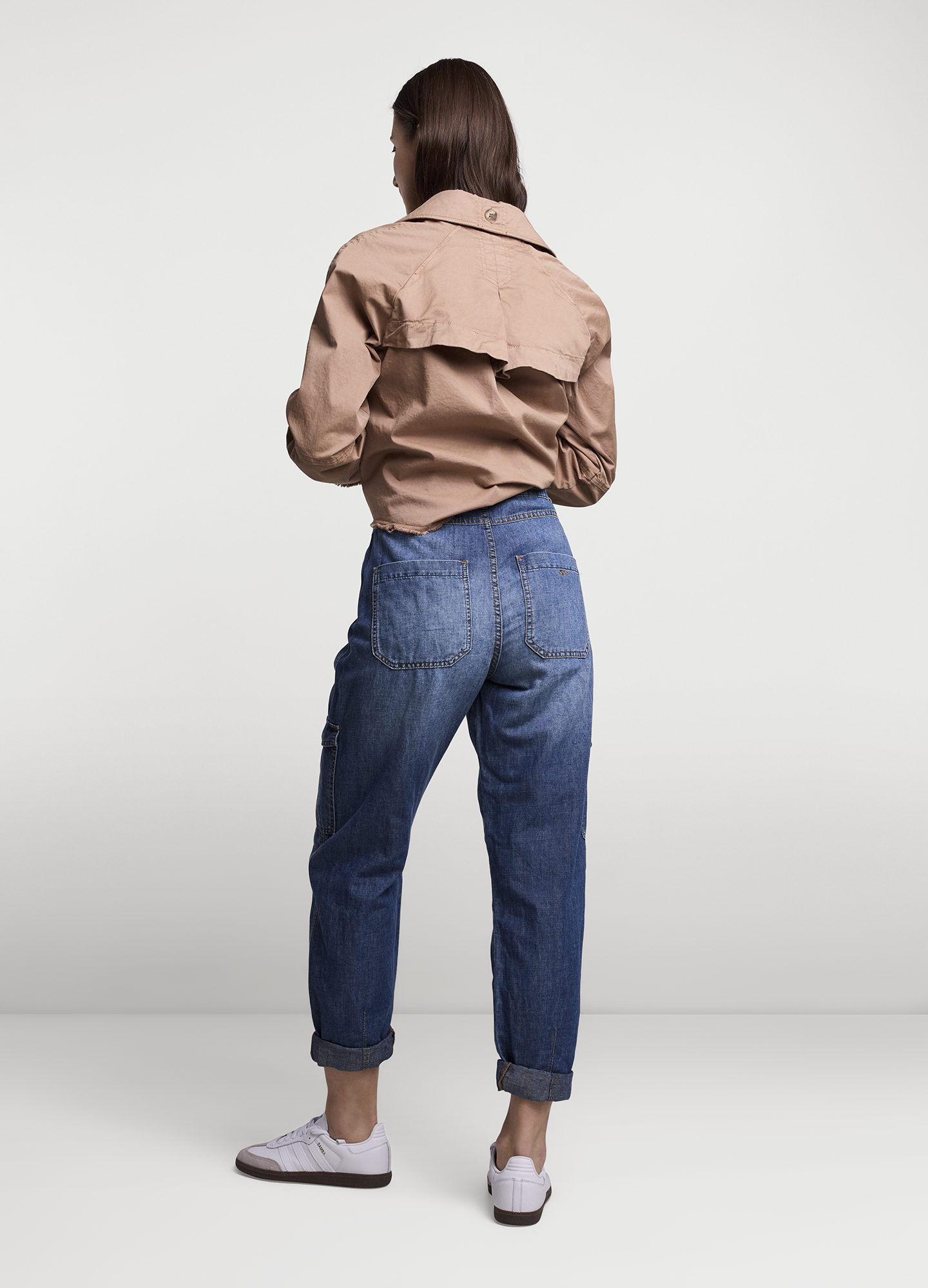 Denim-Cargohose aus weichem, leichtem, nicht dehnbarem Denim dank der Baumwoll-Leinen-Mischung. Die Hose hat eine lockere Passform und abschraubbare Knöpfe, die den Recyclingprozess nachhaltiger machen.