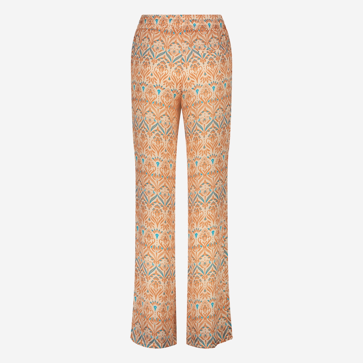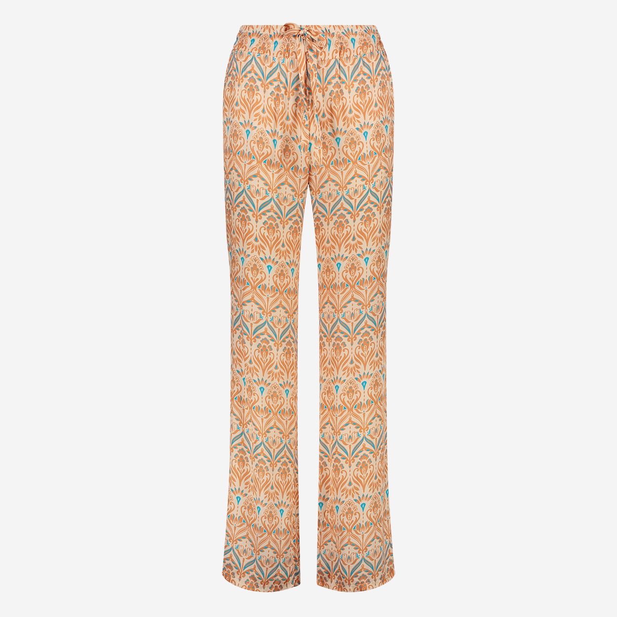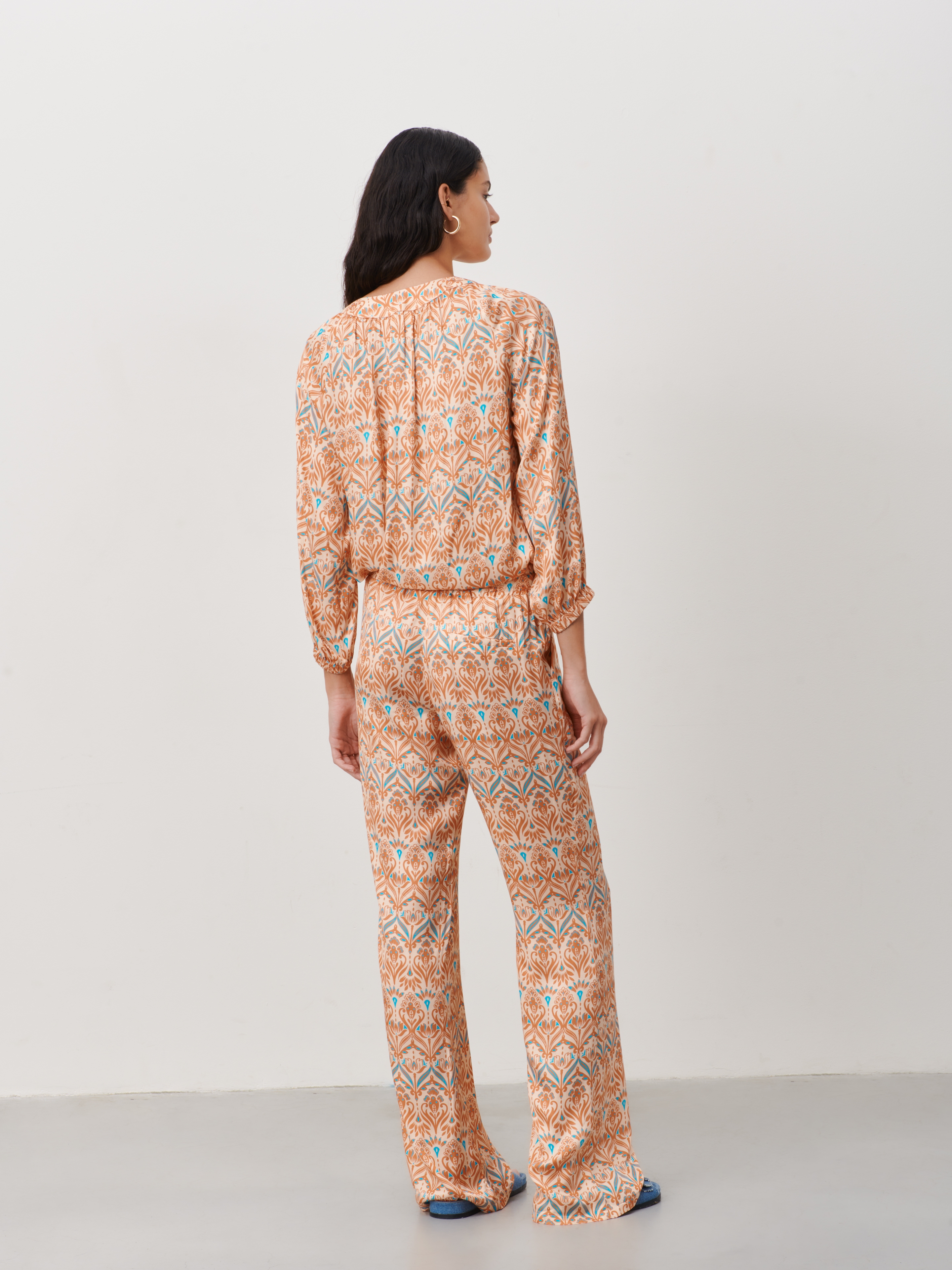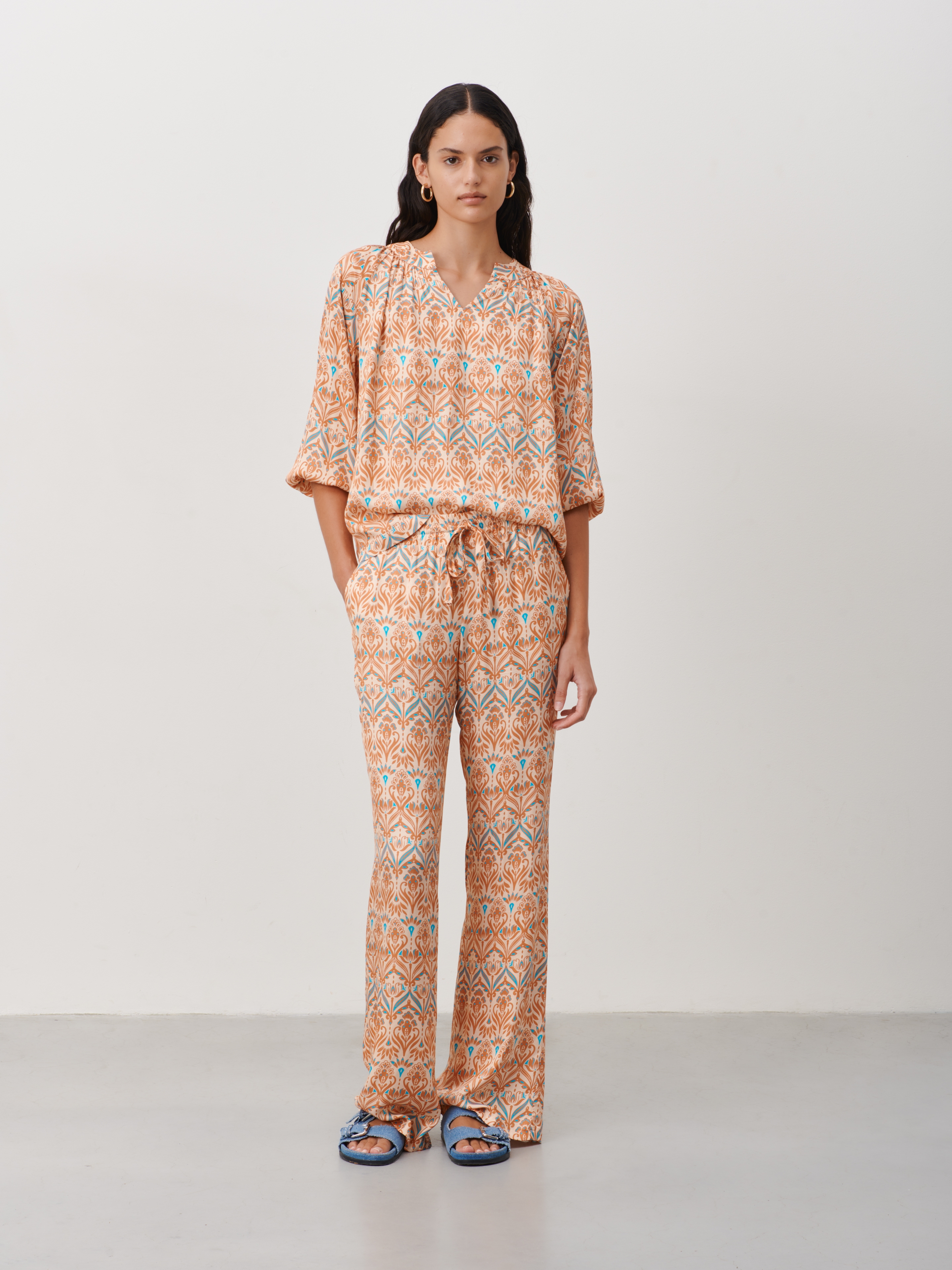 Hose mit geometrischem Aufdruck, breiter elastischer Bund mit Kordelzug, schräge Fronttaschen, gerade, weite Beine, entspannte Passform