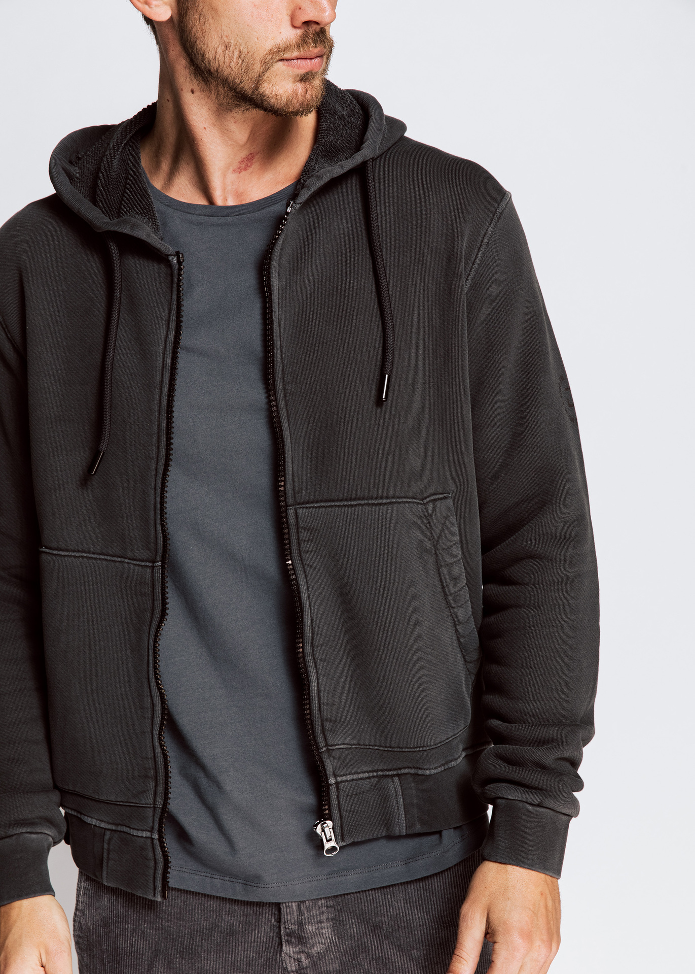 lässige Strickjacke in verwaschenem schwarz mit Kapuze und seitlichen Eingrifftaschen. Rippbündchen