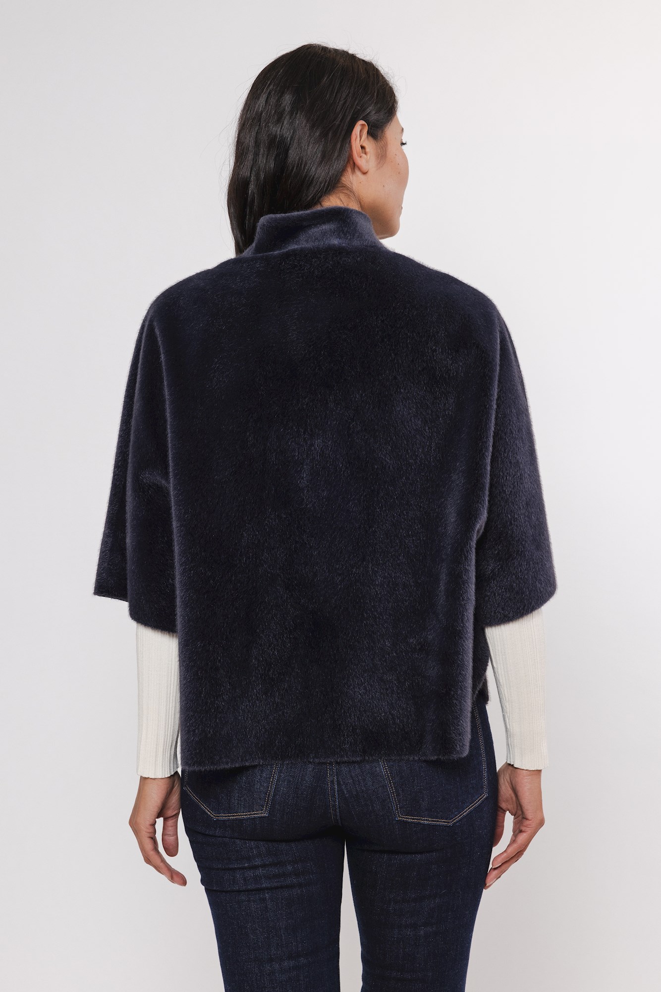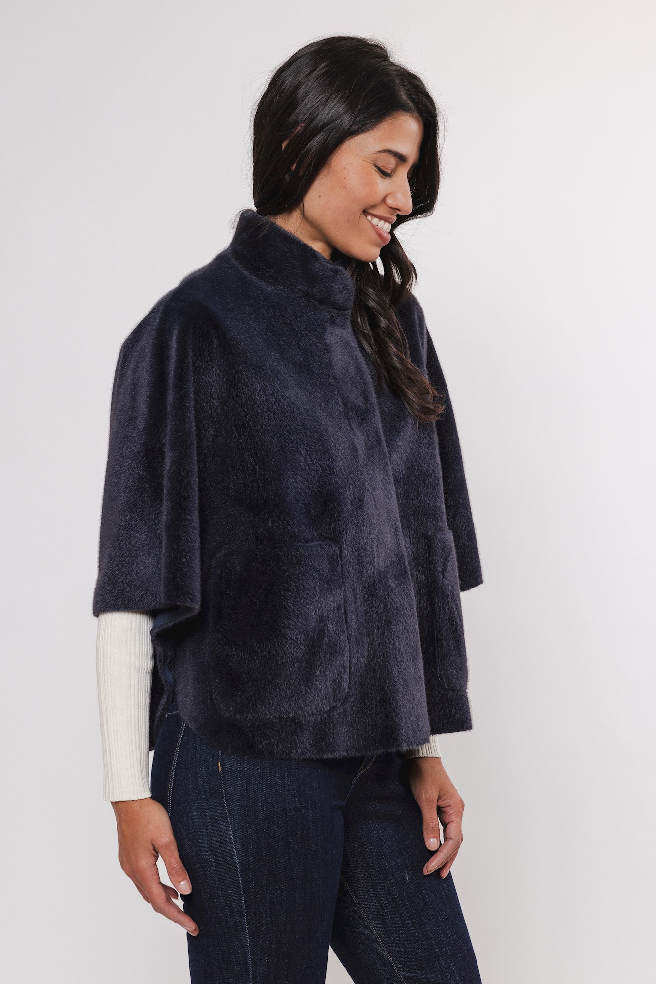 Kunstpelz-Umhang in plüschigem Material, zwei offene Taschen auf der Vorderseite, Druckknopfverschluss auf der Vorderseite, kurze Ärmel und geschlitzte Details an beiden Seiten.