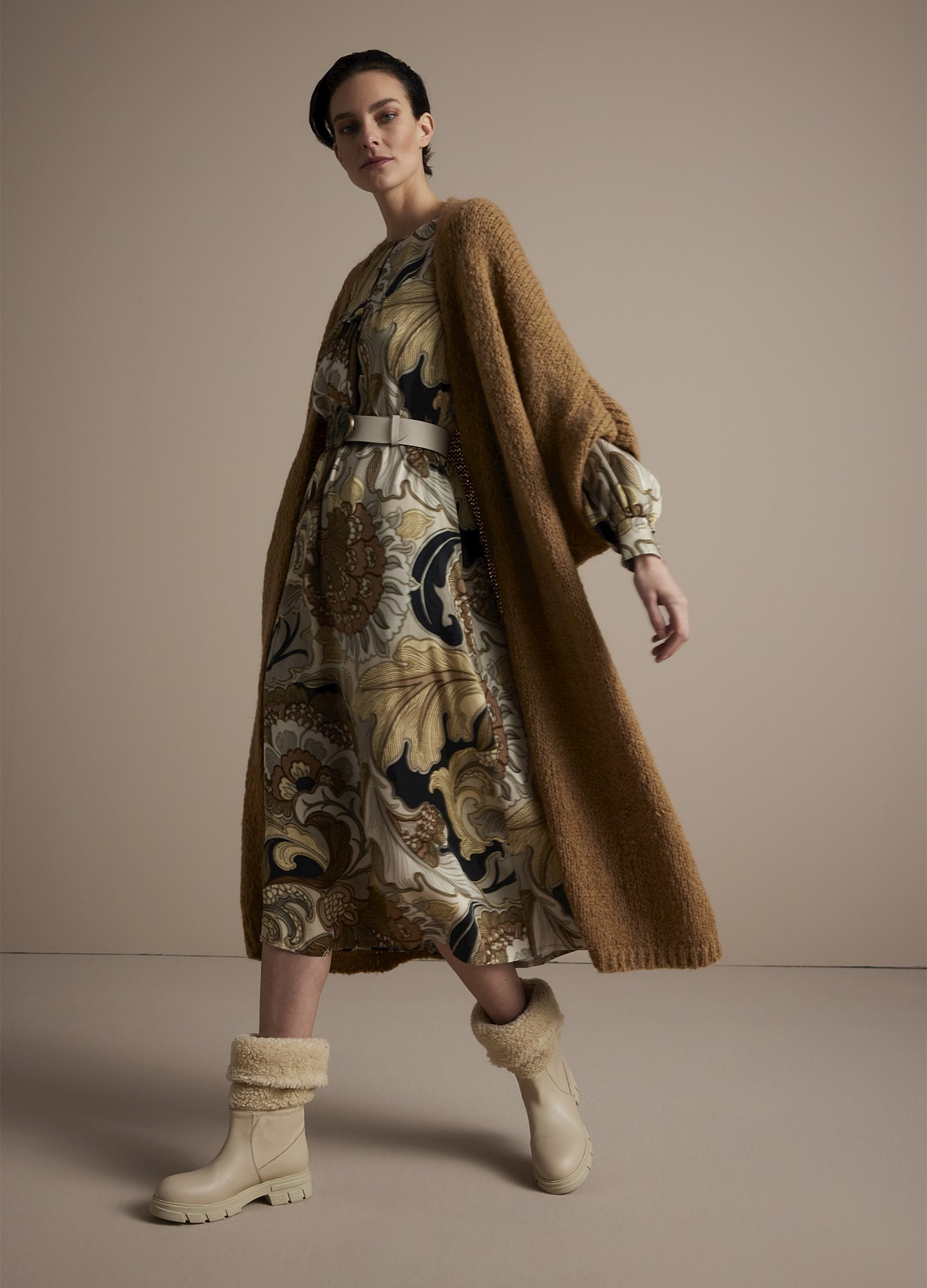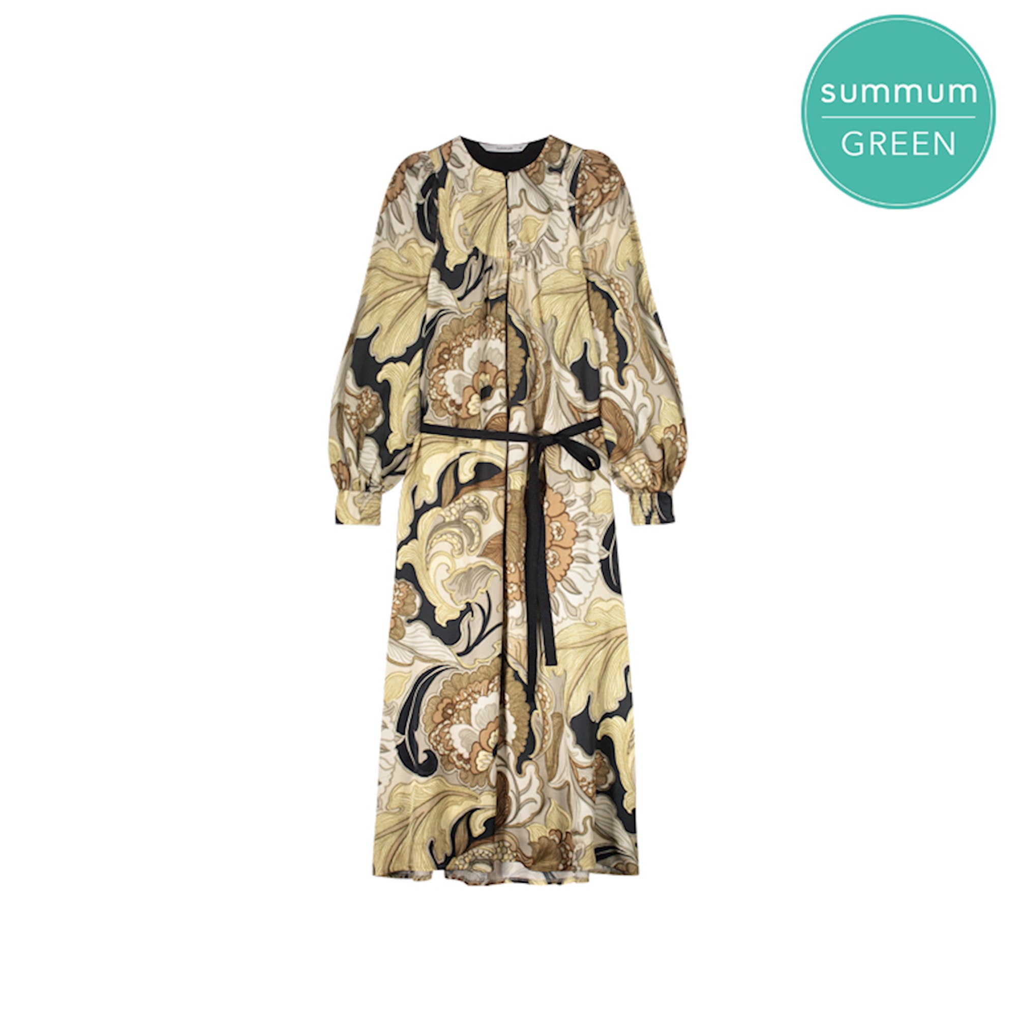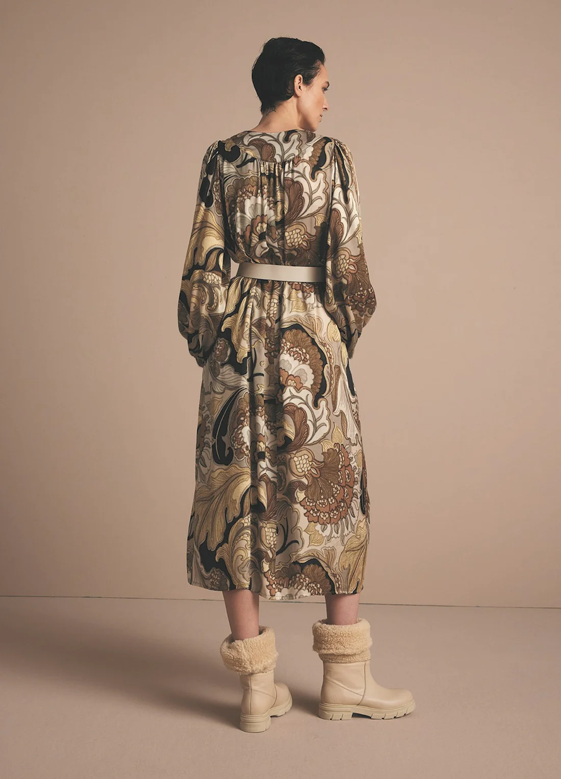 Dieses lange Kleid in entspannter Passform fällt bis über das Knie. Mit einem großen Vintage-Blumenmuster, langen Ballonärmeln und einem auffälligen Rundhalsausschnitt mit Knopfverschluss ist dieses Kleid raffiniert im Detail und lebendig im Aussehen. Der schwarze Gürtel auf Taillenhöhe schmeichelt der Figur.