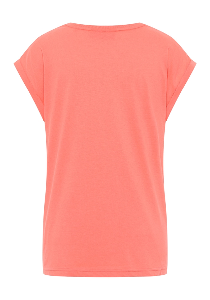 Normal geschnittenes T-Shirt mit etwas weiterem Rundhalsausschnitt, weicher halbtransparenter Print auf dem Vorderteil