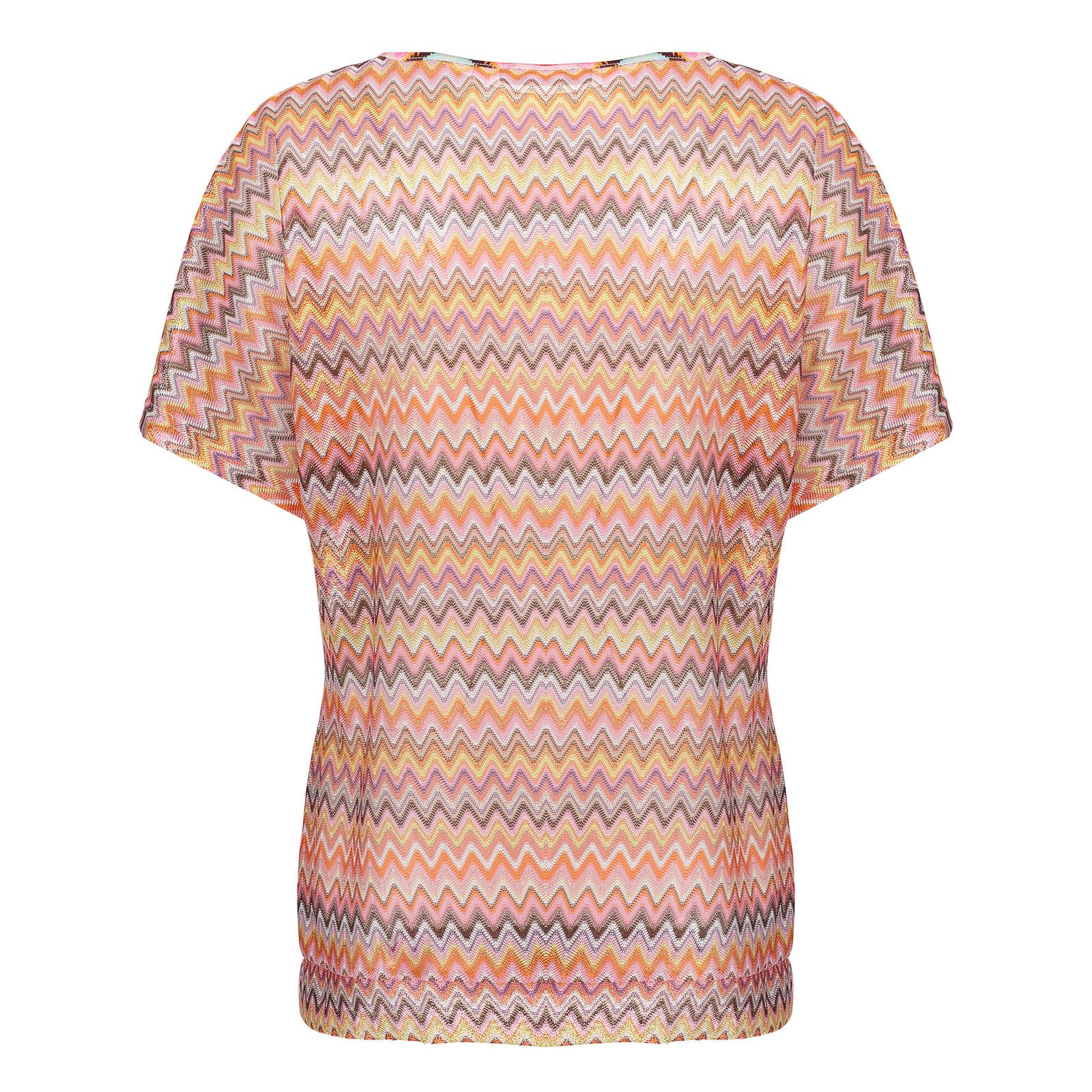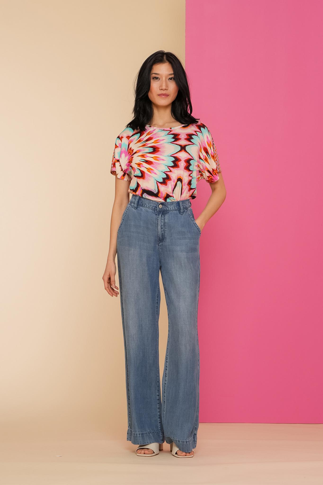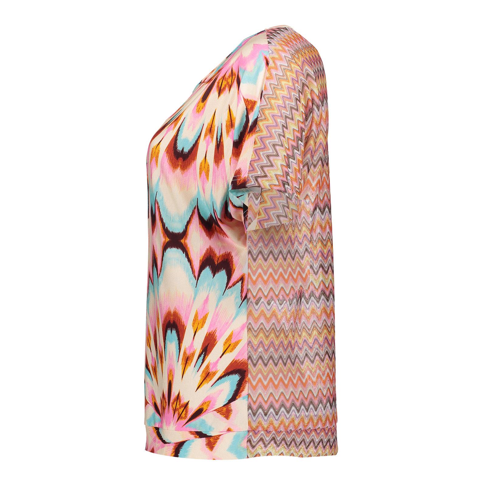 Top mit Allover-Flower-Power-Print auf der Vorderseite und gehäkeltem Zickzackmuster auf der Rückseite, weiter Rundhalsausschnitt