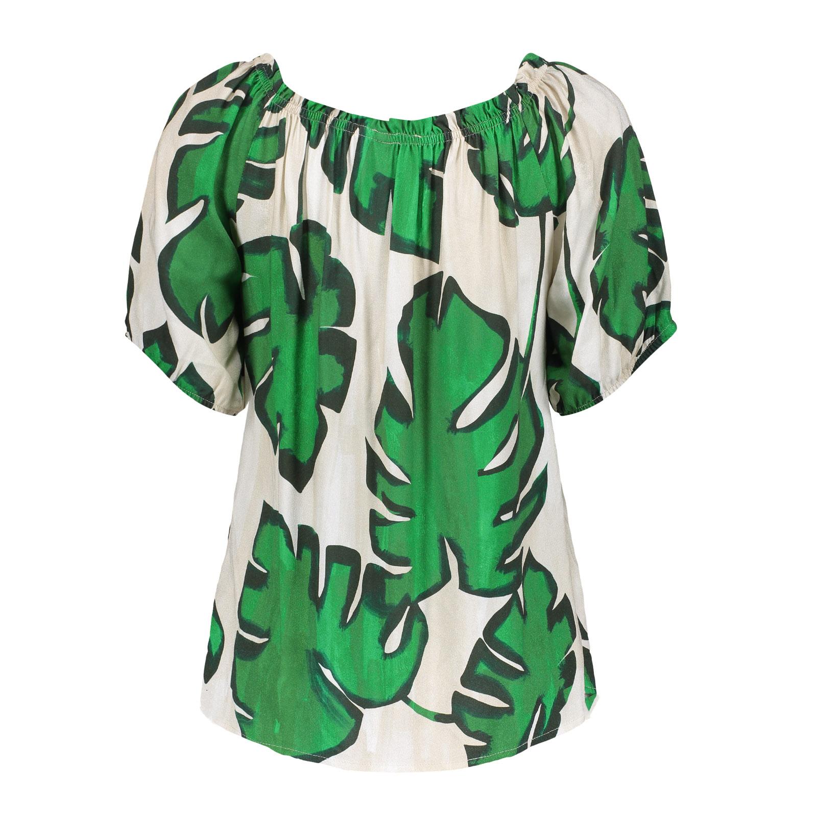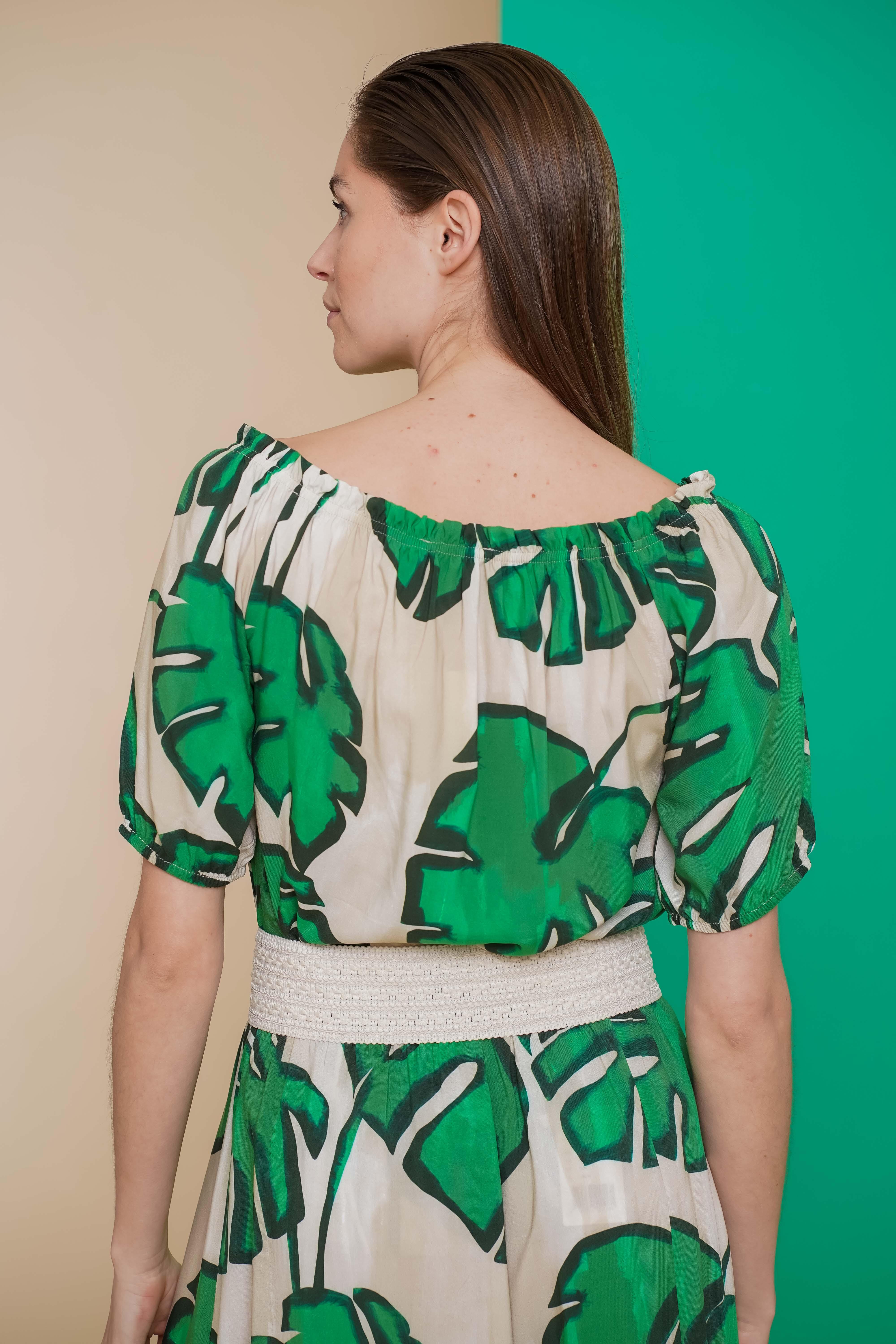 Elastischer Kragen so dass das Oberteil über der Schulter oder schulterfrei getragen werden kann, Puffärmel mit elastischen Bündchen, Allover-großer Blattdruck,
