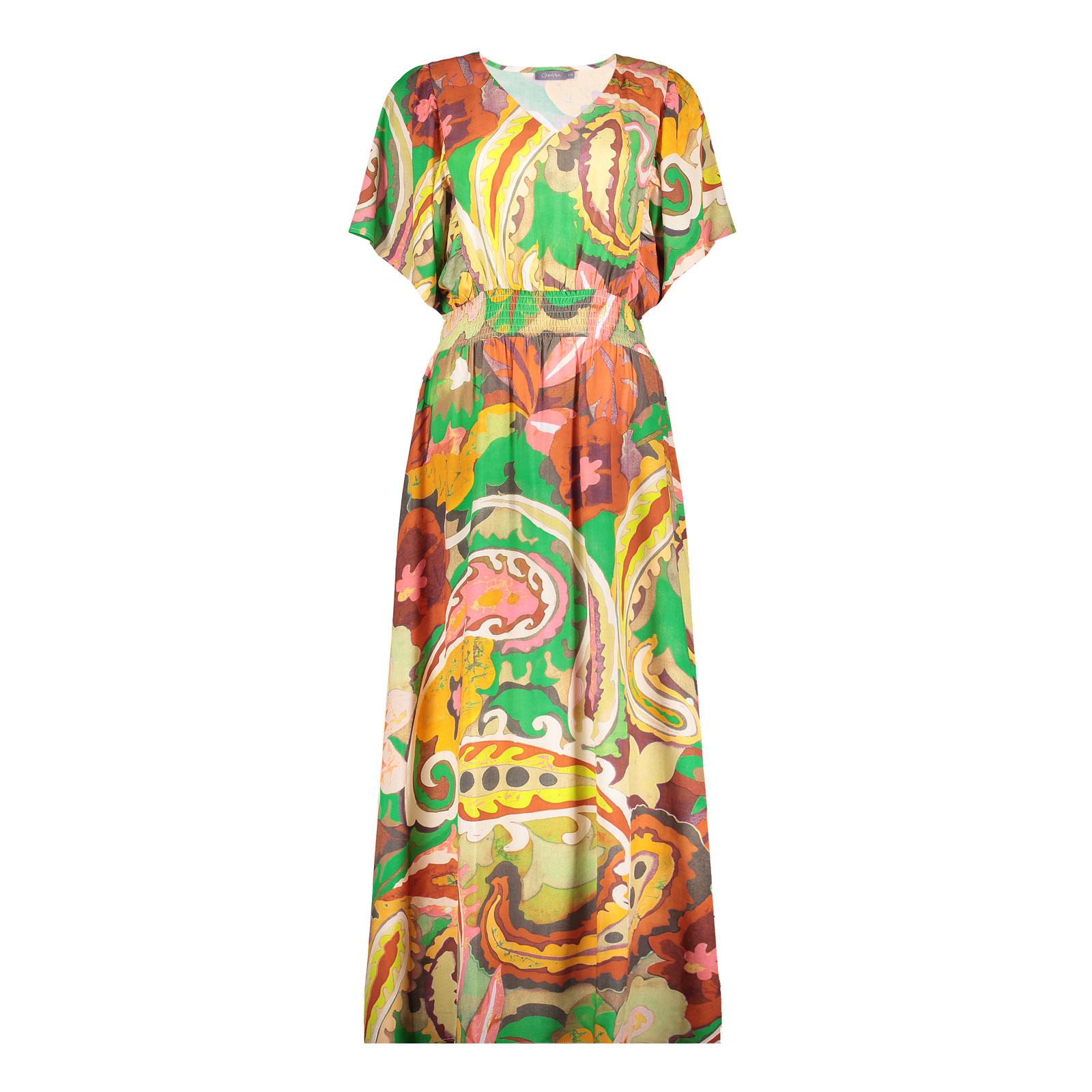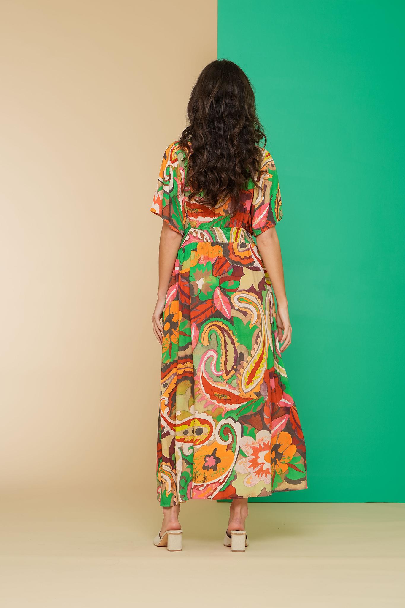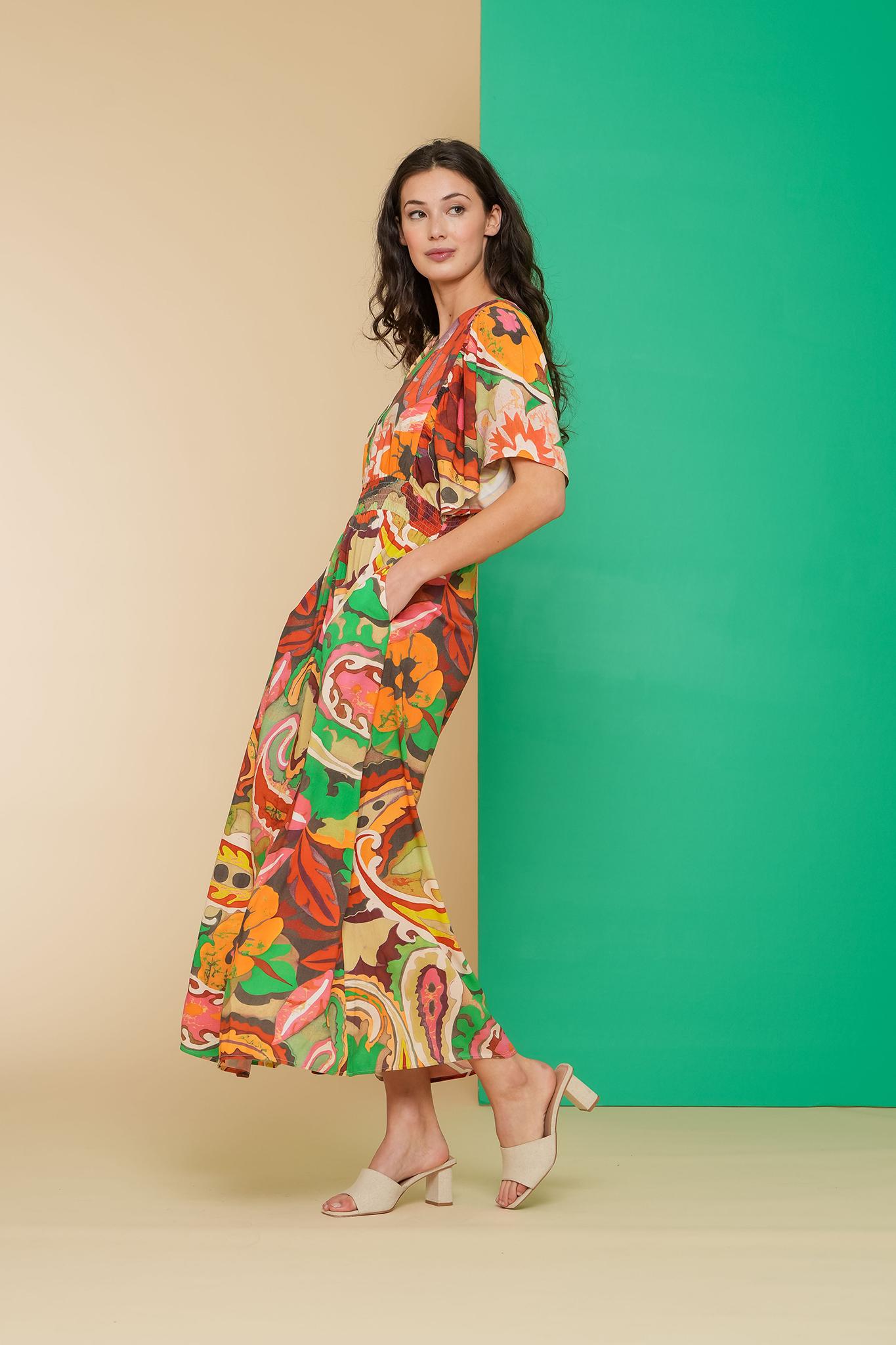 Sommerkleid mit buntem Aufdruck in green coral, gerader Fall bis zu de Knöcheln, V-Ausschnitt, kurze Schmetterlingsärmel, gesmokter, elastischer Saum, seitliche Eingrifftaschen