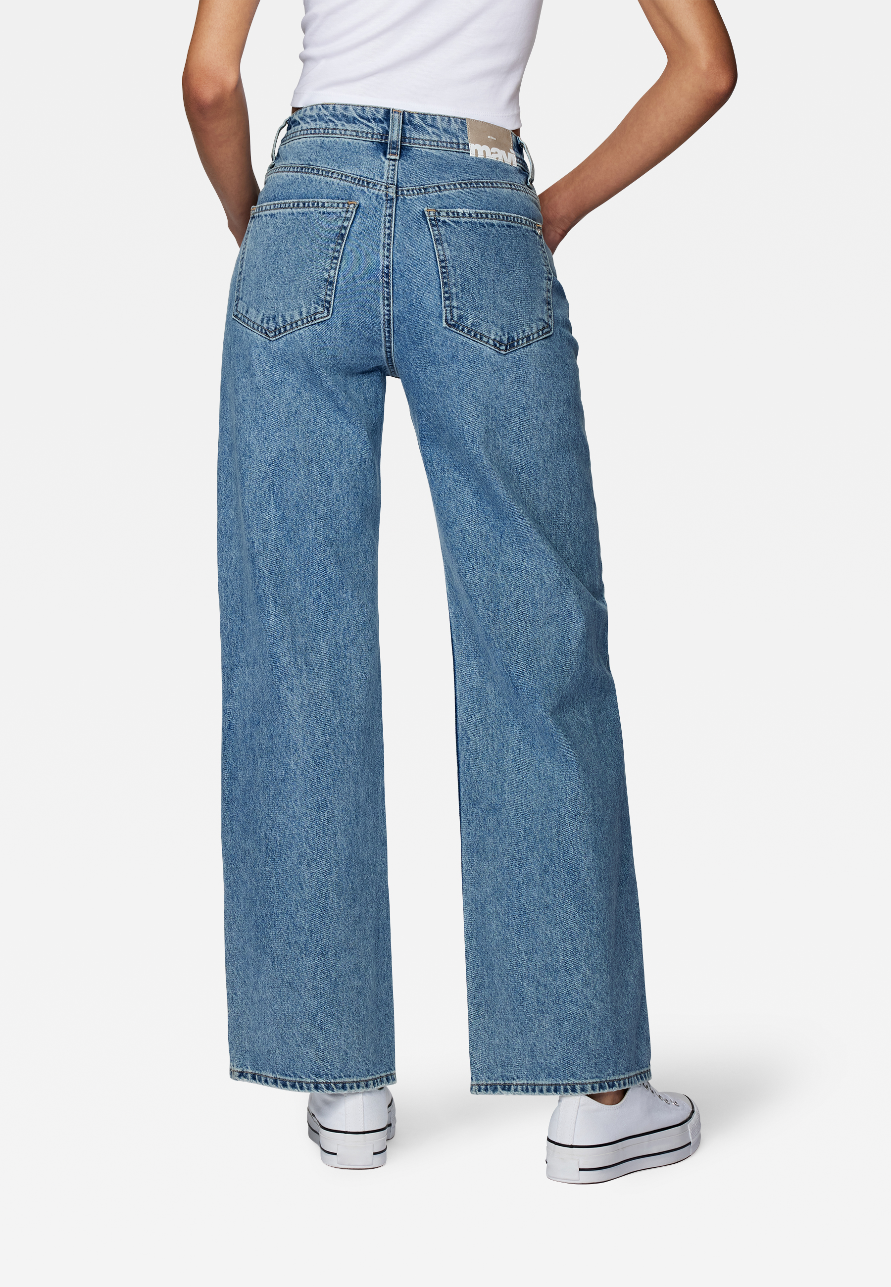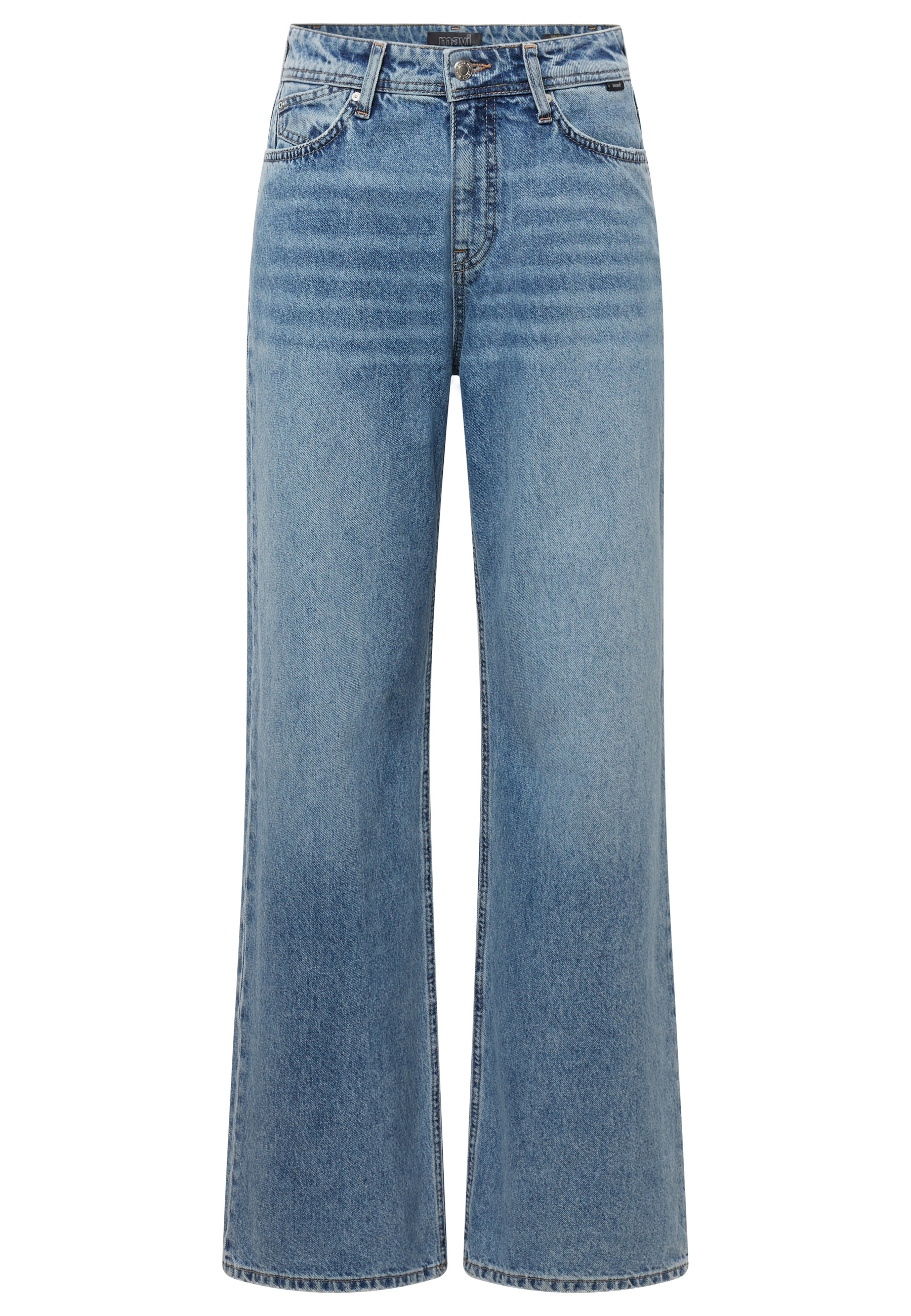 Bootcut jeans in mid blue denim , weit ausgestellte Hosenbeine, hoher Bund, 5 Pocket design