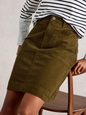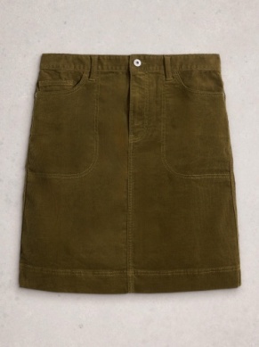 Stylische Kordrock in Khaki grün, klassischer Schnitt Knopfverschluß, seitliche Eingrifftaschen, Knielang,
