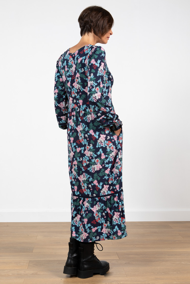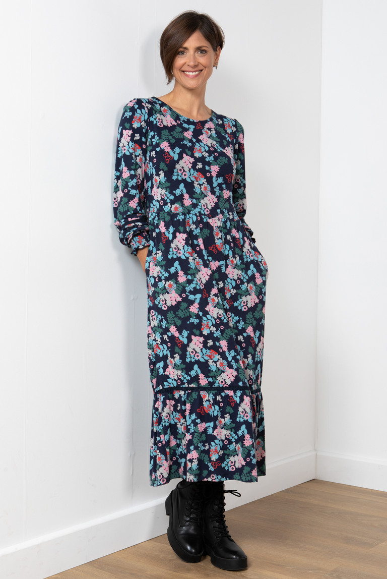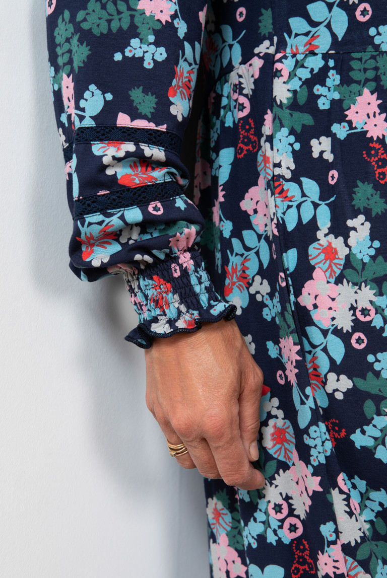 Ein wunderschön feminines Kleid mit entspannter Passform . Der weiche, aber schwere Fall dieses Stoffes trägt zu seiner Eleganz bei. Praktische Taschen und feine Details mit gerafften Ärmeln, elastischen Bündchen und Spitzenbesatz aus Baumwolle sorgen dafür, dass dies Ihr herausragendes Kleid der Saison wird.