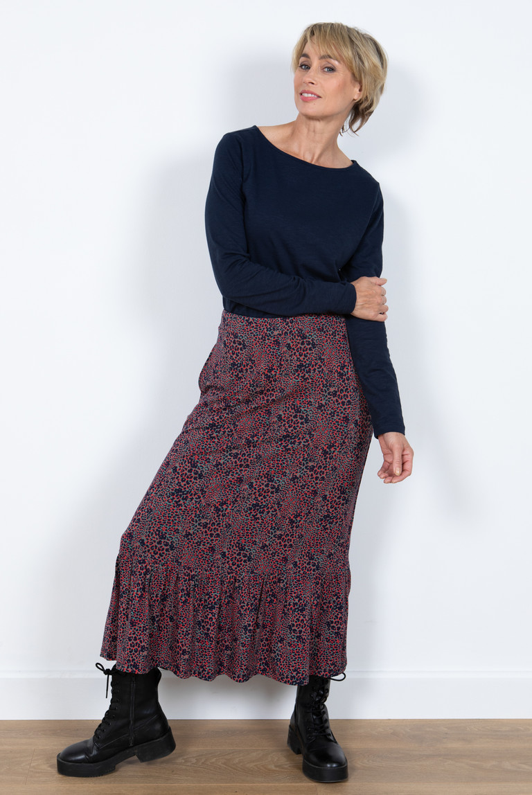 Ein wunderschöner, vielseitiger Midirock mit Seitentaschen und elastischem Rückenteil. Tiefer Saum mit Baumwollbesatzdetail und elastischer Bund für zusätzlichen Komfort und Passform.