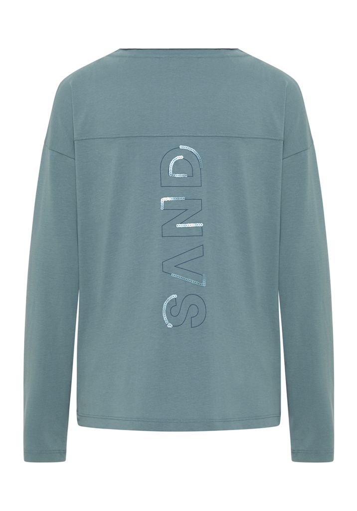 Longsleeve- shirt, Rundkragenausschnitt, halbtransparenter Druck mit Pailettenbesatz an Vorder- und Rückseite