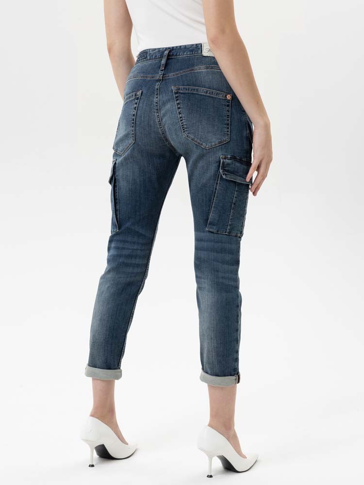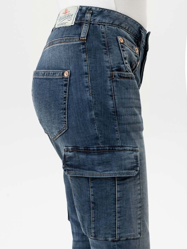 Cargo-Damenjeans, weicher Sweat Denim, hohe Leibhöhe , Fit: Boyfriend , raffinierte Seitennähte und Abnäher, 7/8 Cropped Länge, seitliche Kargotaschen, umgeschlagener Saum, mit halbverdeckter Knopfleiste