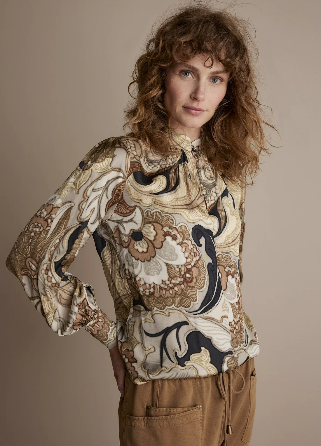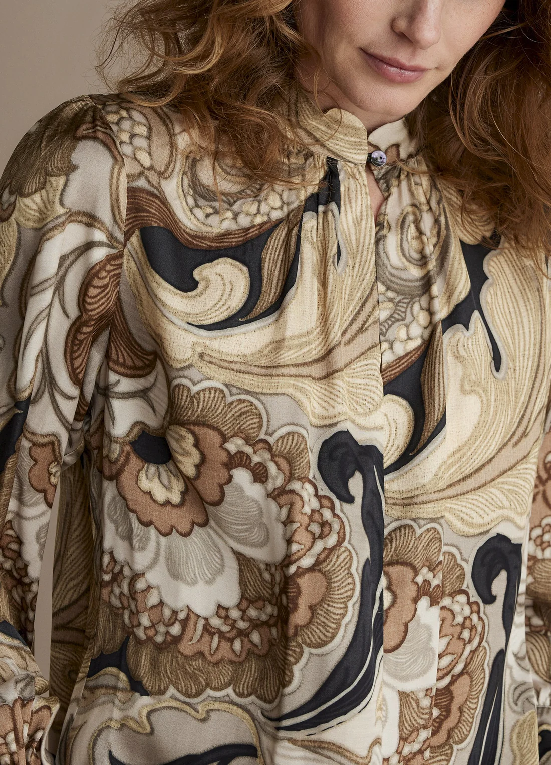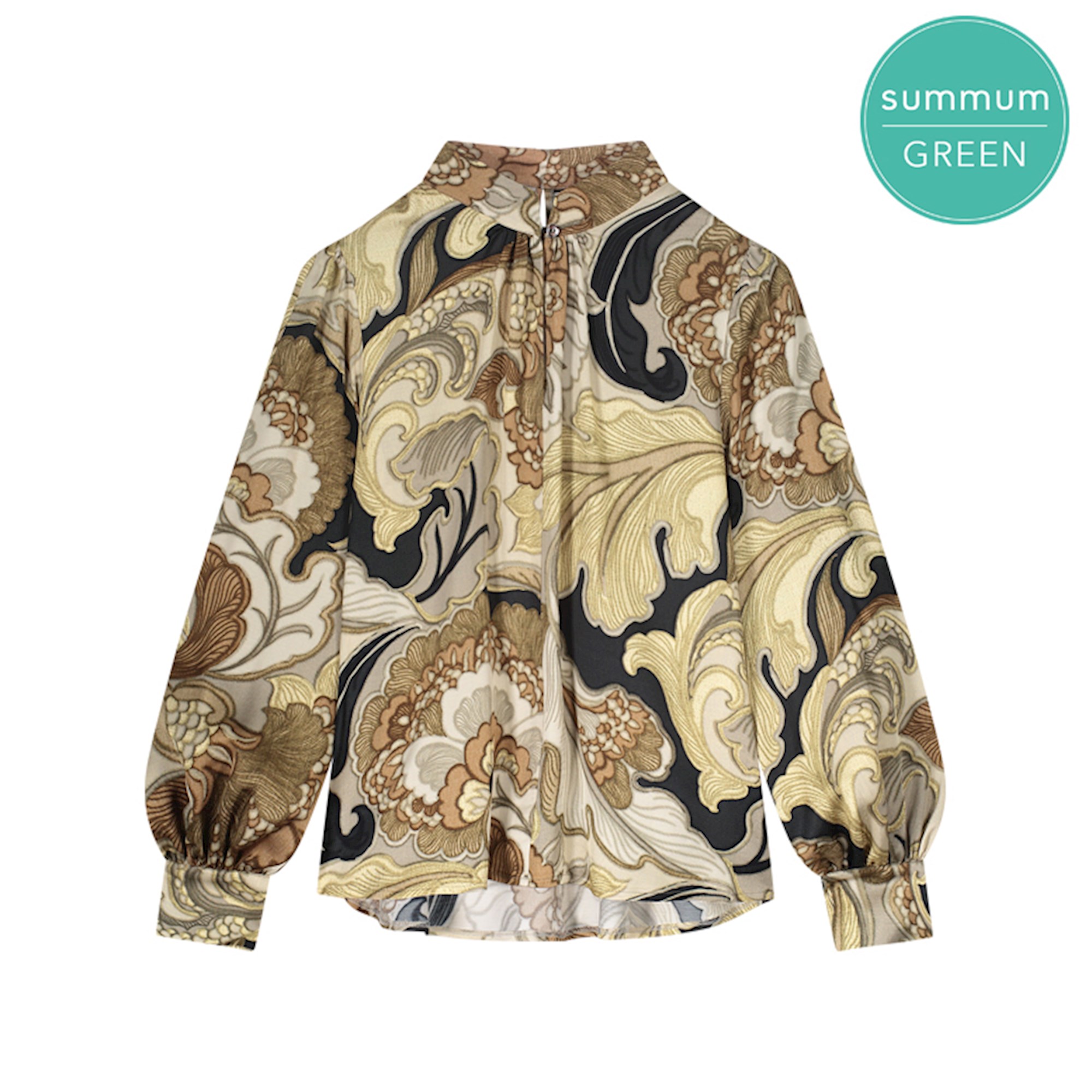 Dieses Vintage-Top ist aus einem bedruckten Satinstoff mit üppigem Blumenmuster. Die Bluse hat einen Stehkragen mit Schlitz und Knöpfen. Die leichten Ballonärmel mit Manschette und die geschmeidige Passform unterstreichen den üppigen Look des floralen Motivs.