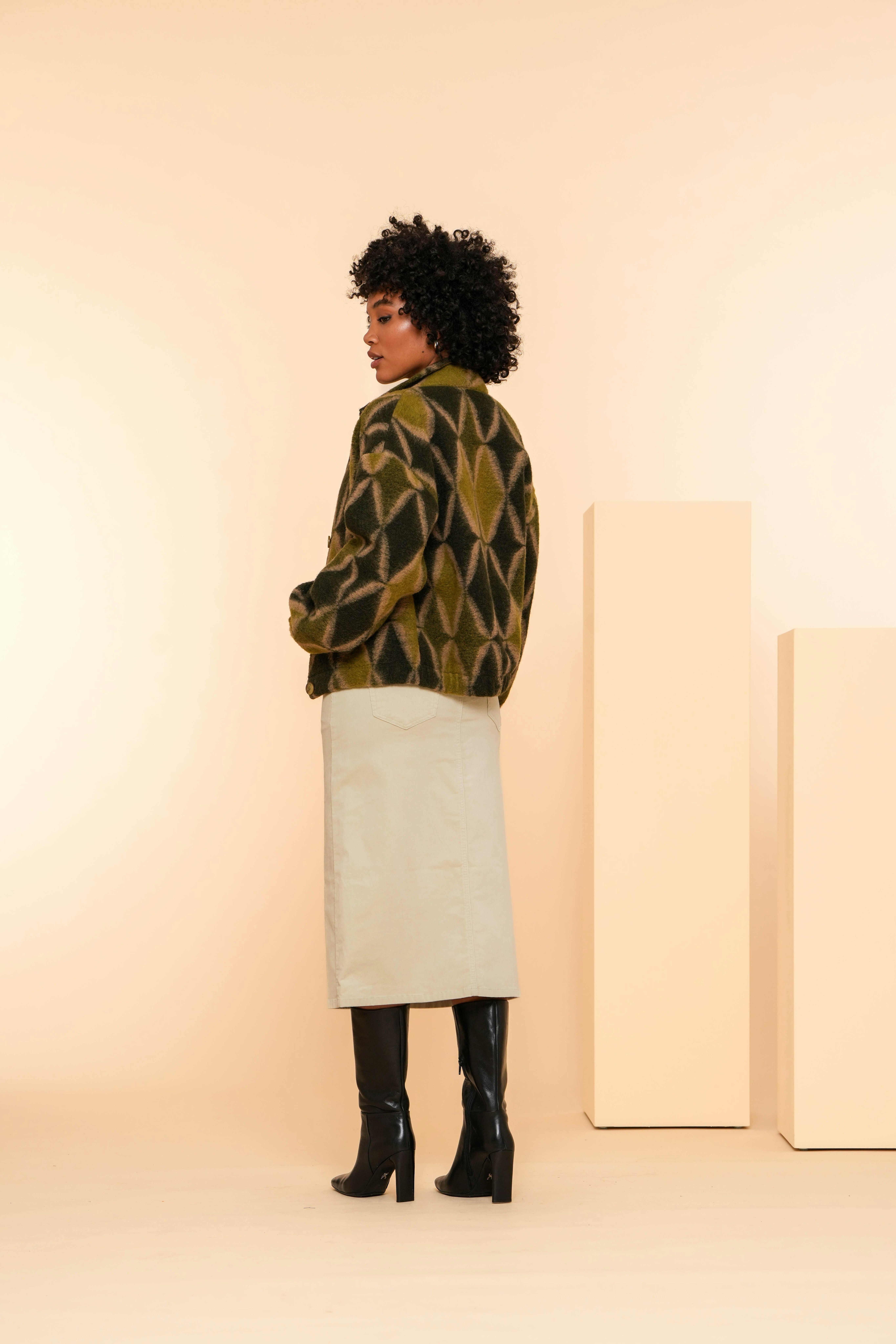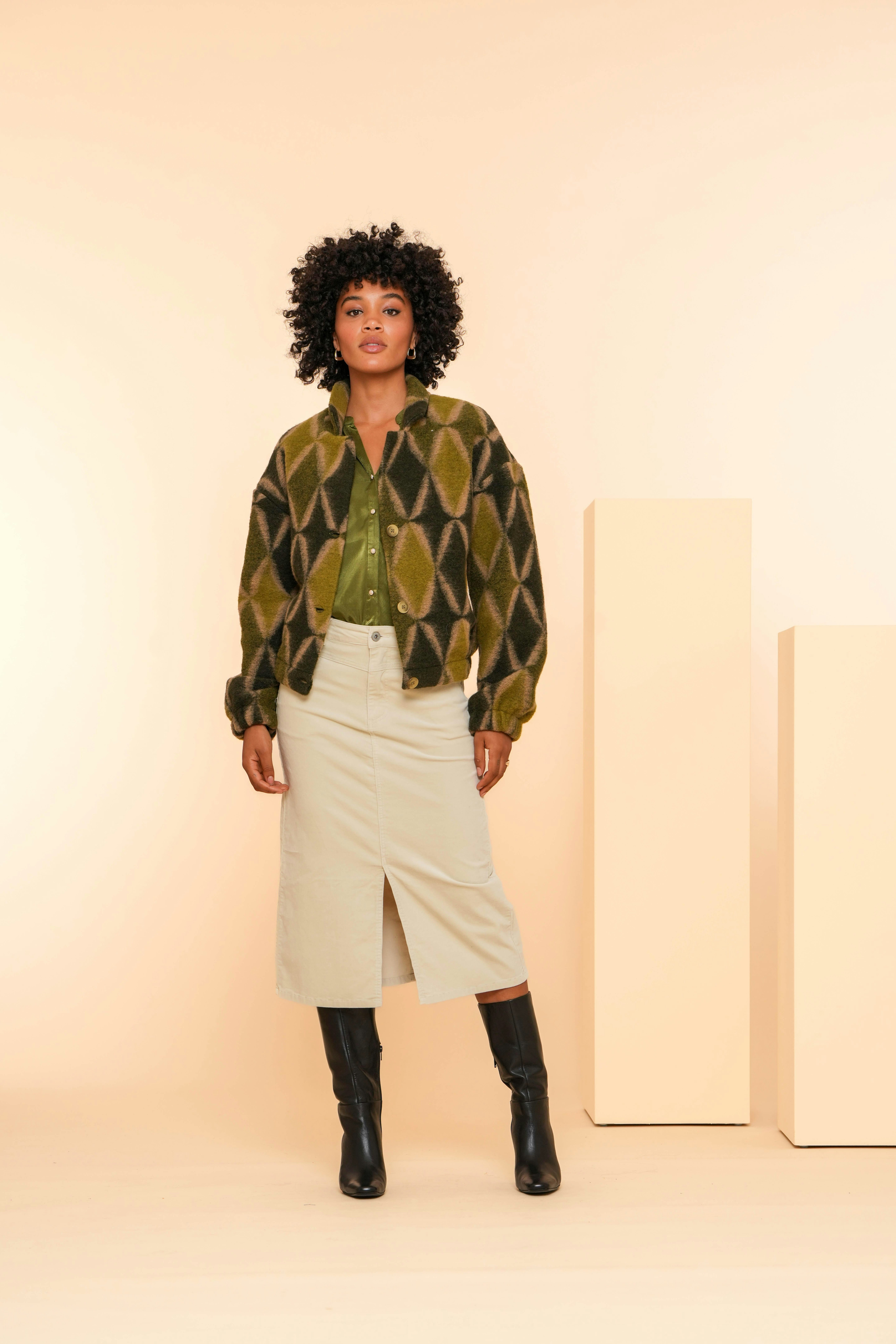 Kurzer sportlicher Blazer der bis auf die Hüften fällt.• Ärmel mit elastischen Bündchen. Knopfverschluss , allover grüner Mehrfarbendruck